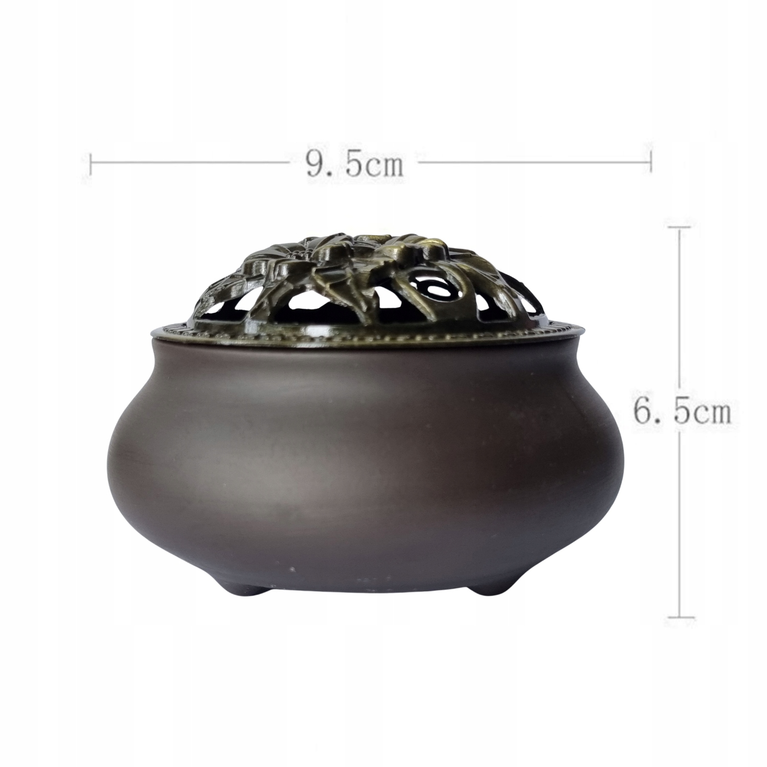 - из высококачественной керамики коричневого цветас крышкой из металла, украшенной красивым b>ажурный узор, обеспечивающий оптимальные условия для равномерного горения. благовония и распространение аромата,