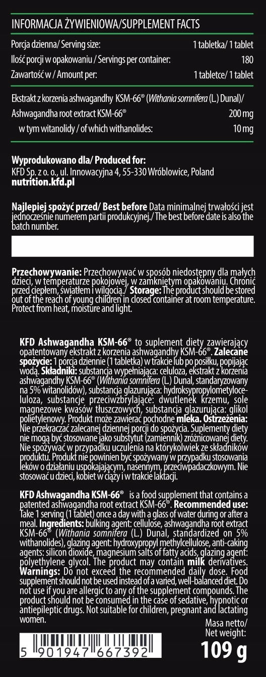 kfd ashwagandha k-66 forte является хорошо известным и ценным экстрактом из корня Smaloma (Withania Somnifer), известный на протяжении веков аюрведической медицины. Есть много исследований и публикаций по предмету Smalfaugal Witania.