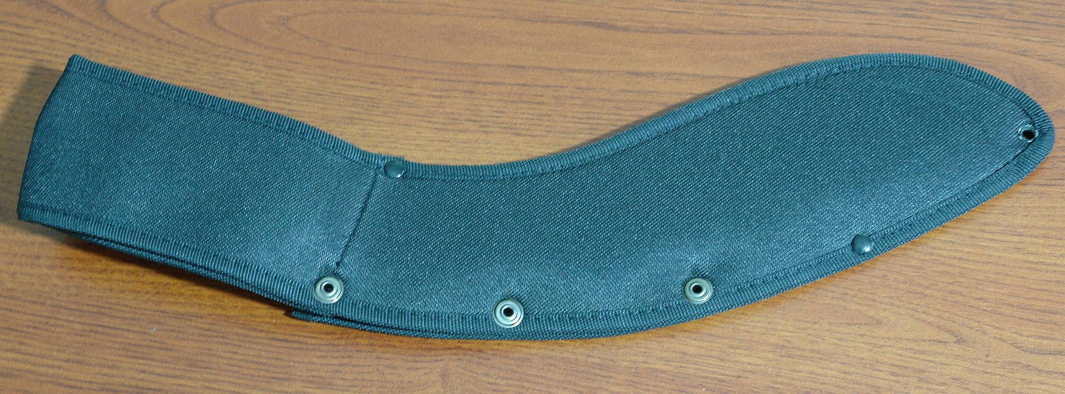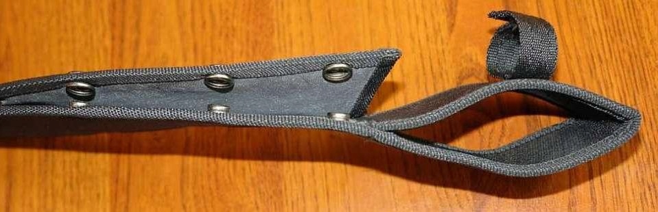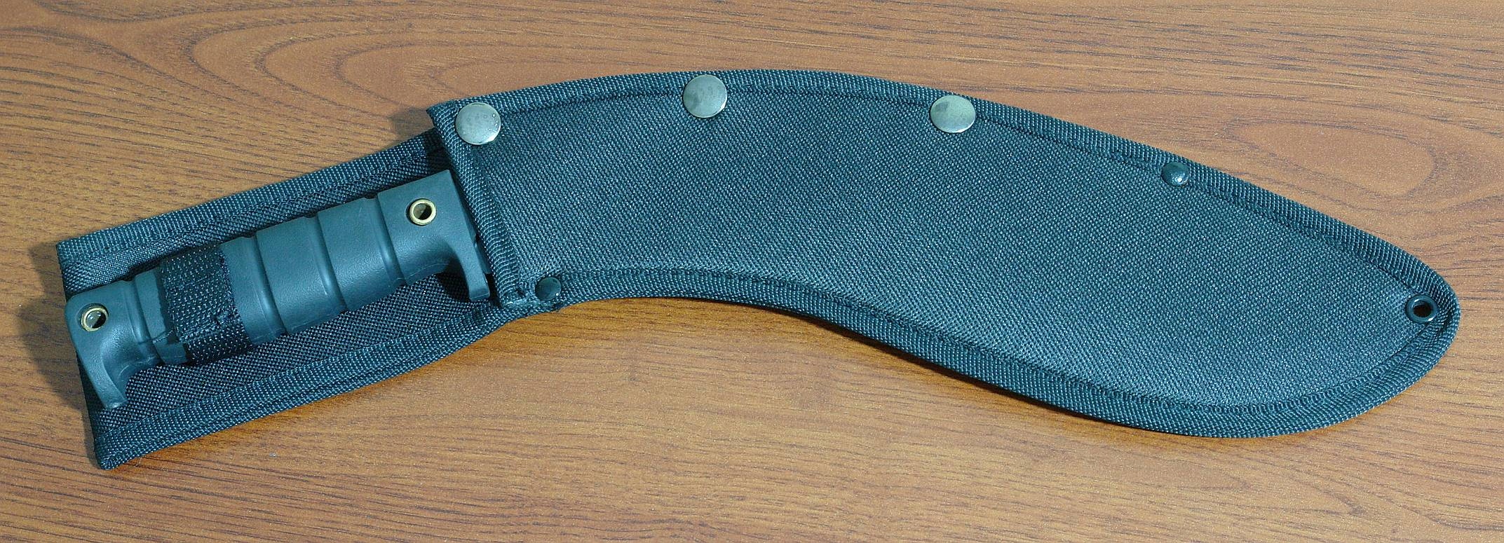 - Рукоять отлита непосредственно под давлением. на хвостовике лезвия, изготовленном из прочной полимерной резины, матового черного цвета, с пятью канавками вокруг рукоятки, что предотвращает натирание рук и обеспечивает лучший и безопасный хват. Дополнительно в рукоятке имеются два отверстия, усиленные запрессованными латунными трубками. Нож носится в широких ножнах из толстой (двухслойной) прочной нейлоновой ткани, отделанной и усиленной металлической фурнитурой. Чехол имеет крепление для военного ремня и отверстие в нижней части для привязывания кукри к бедру ноги.