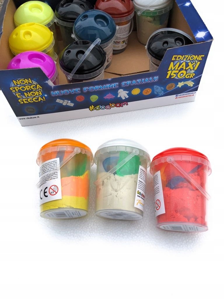 Набор из 12 упаковок по 150 грамм (всего 1,8 кг) кинетического песка с блестками и 24 формочек.