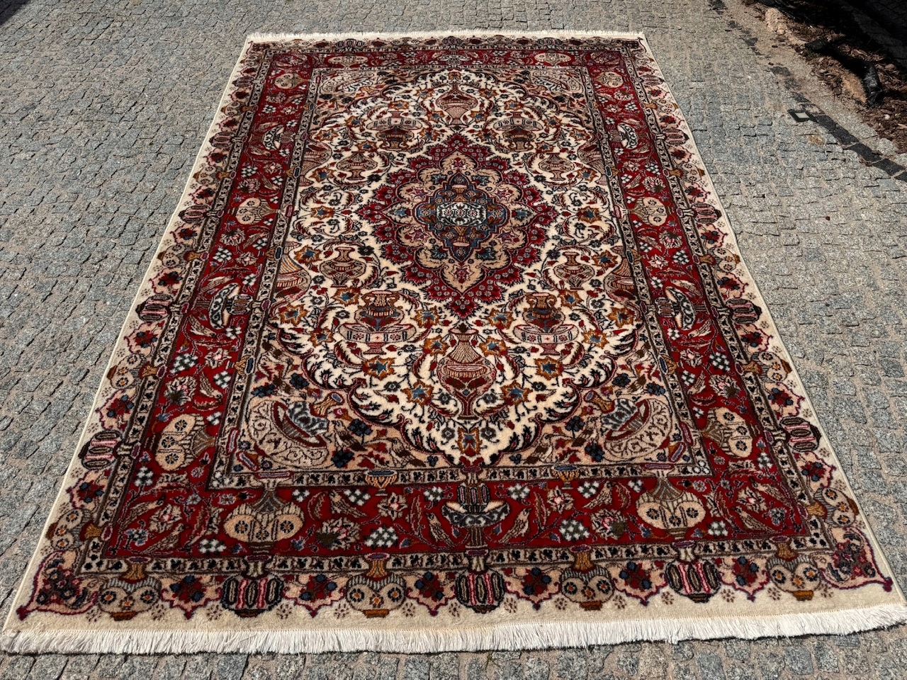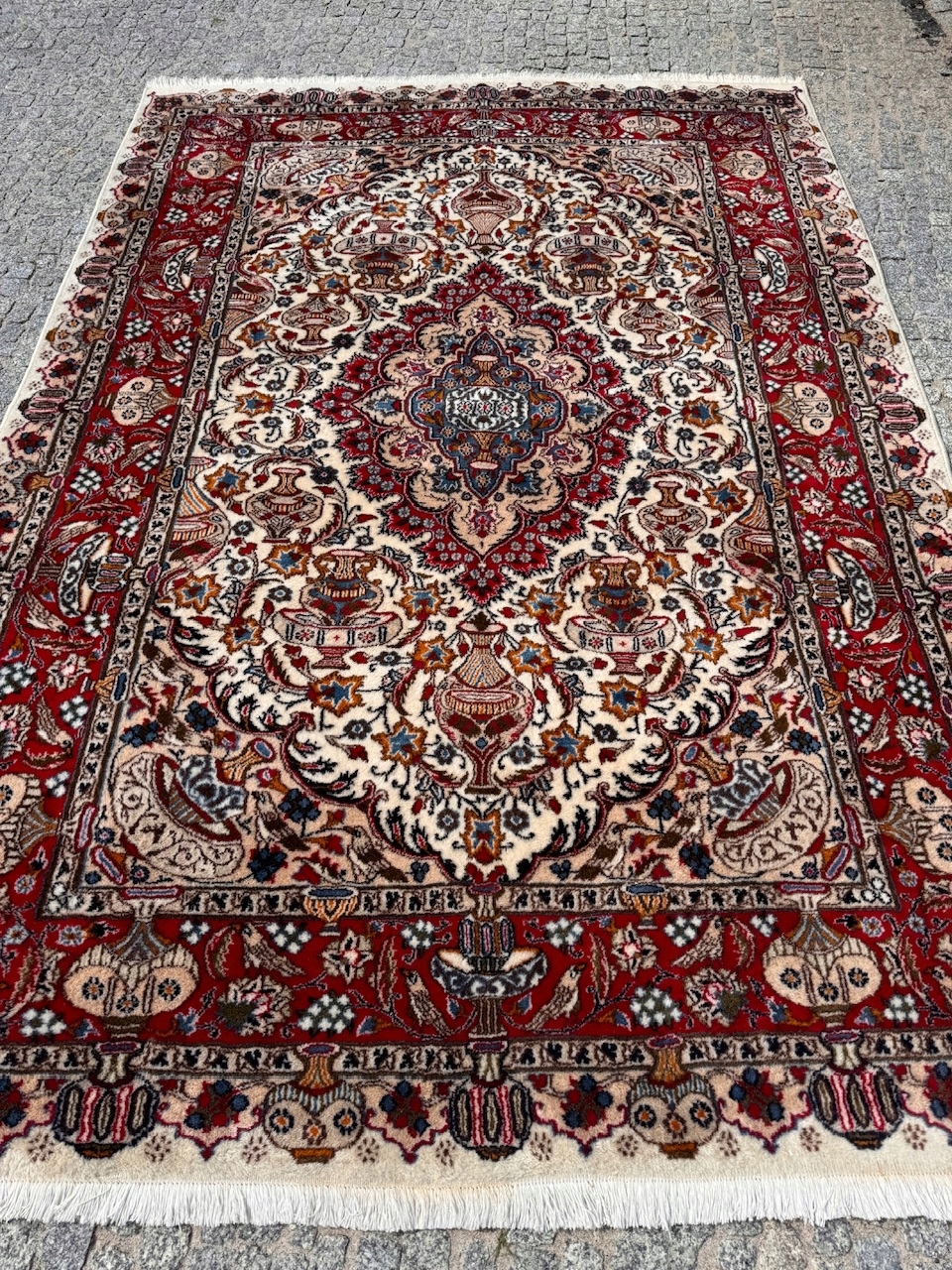 Субъект: Персидский коврик -рука -Струженная оригинальная из провинции Кашмар. По запросу есть тег под ковром + бумажным сертификатом. В галерее перед скидкой это стоило 6500 евро или около 29 000 человек. уникален из -за его шаблона. Это очень высокий коврик.
