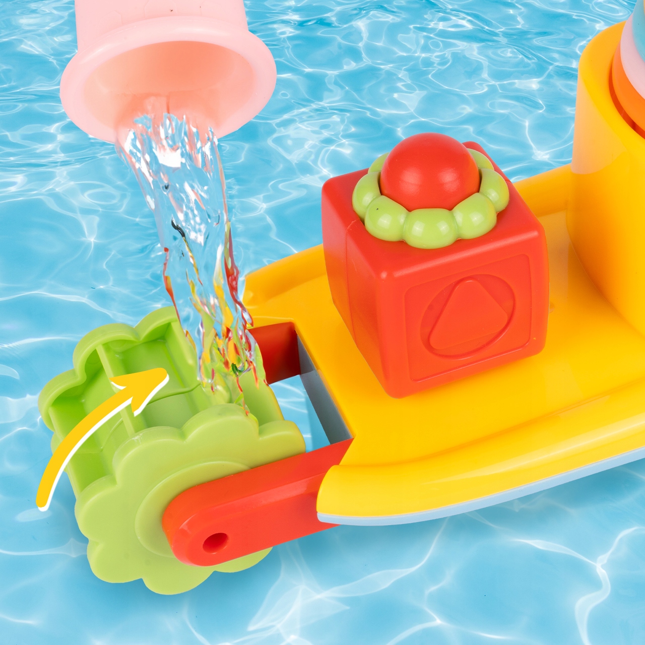 Катушка, размещенная на задней части лодки, может быть повернут ребенком, что добавляет дополнительный элемент взаимодействия и механического веселья