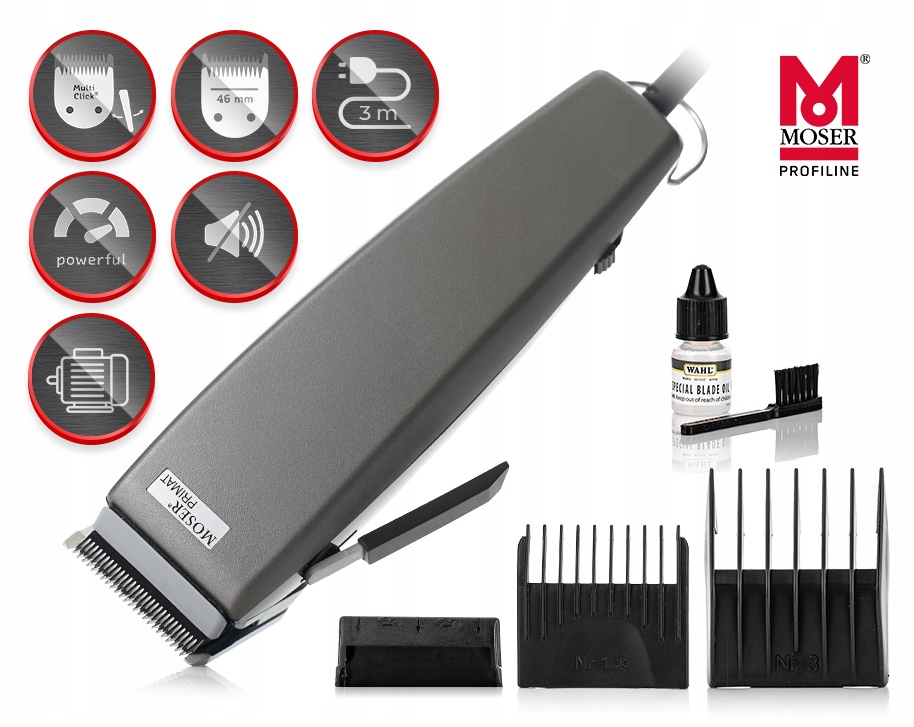 Moser Primat Titan 1230 PRO — машина, произведенная в Германии, в самом сердце Шварцвальда, что гарантирует высочайшее качество. качества изготовления и долговечности. Устройство оснащено новым мотором с усиленной катушкой, который отличается чрезвычайно тихой работой – ниже 60 дБ. Длинный 3-метровый шнур питания обеспечивает свободу движений во время работы, а эргономичный корпус с системой гашения вибраций делает бритву комфортной в использовании даже в течение многих часов.
