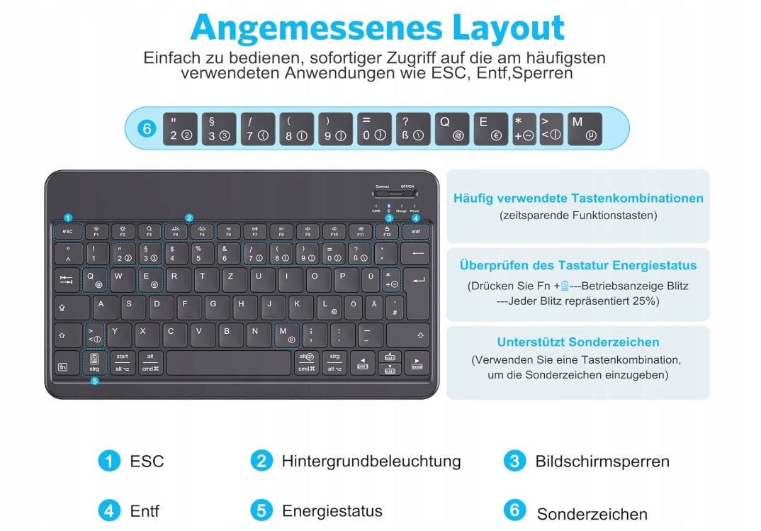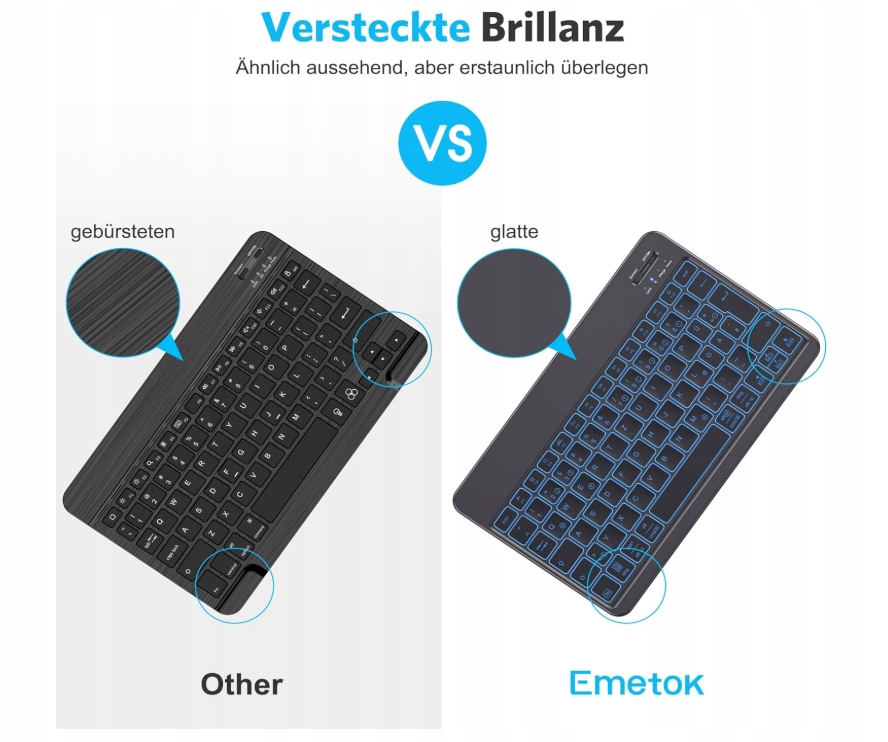 Вы ищете беспроводную клавиатуру, которая будет работать с вашим iPad, iPhone, Samsung или планшетом с Android? emetok - это надежная, тонкая клавиатура Bluetooth с немецкой ключевой системой, которая сочетает в себе удобство письма с современным дизайном и эффективной подсветкой!