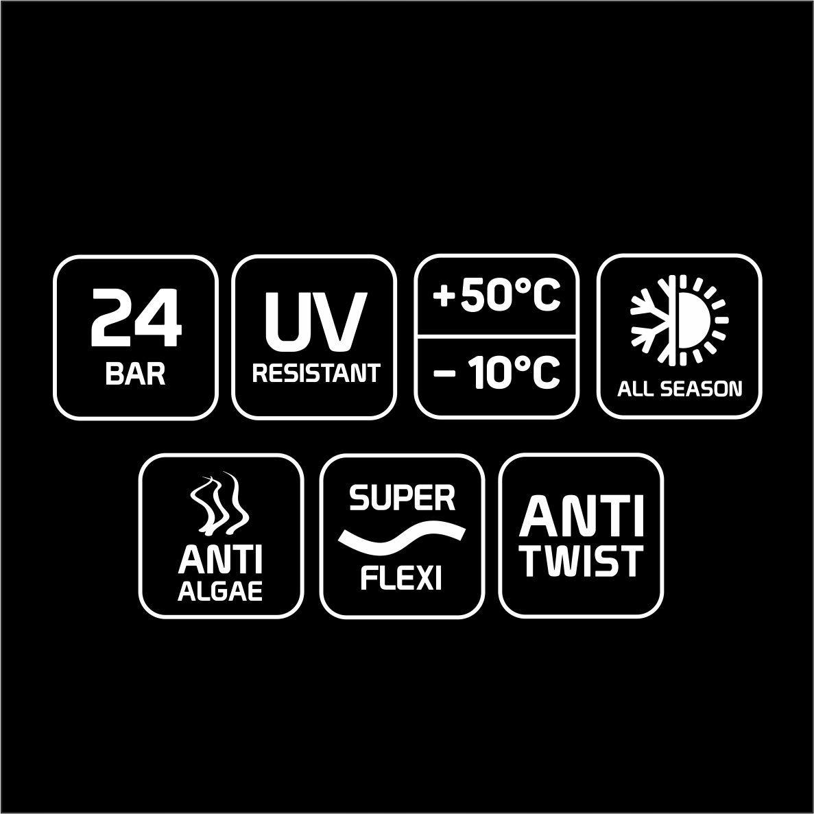 Оранжевый садовый шланг, благодаря использованию высококачественных материалов, характеризуется максимальной прочностью воды 24 бар, сопротивлением ультрафиолетовым излучениям и рабочим температурам в диапазоне от -10 ° C до +50 ° C, поэтому его можно использовать в течение всех сезонов. Это также отличается сопротивлением осаждению водорослей внутри и высоким уровнем гибкости, благодаря тому, что оно не поворачивается