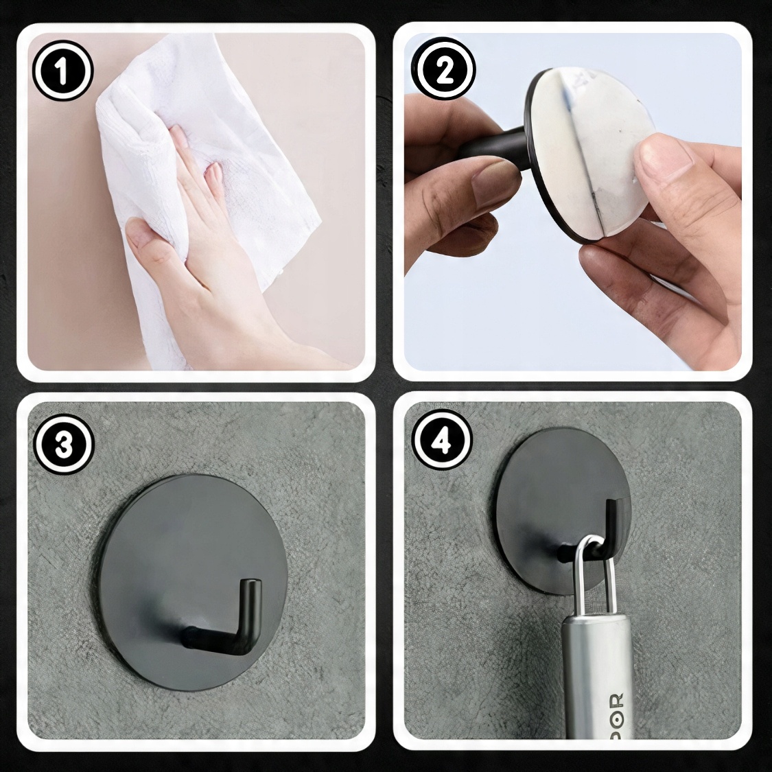 Установка крючков совершенно беспроблемна. Все, что вам нужно сделать, это очистить поверхность, удалить скотч и прикрепить вешалку к стене. Он отлично работает на плитке, обычных стенах или панелях. Используйте крючки через 24 часа после прикрепления!