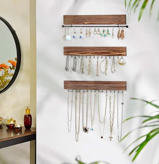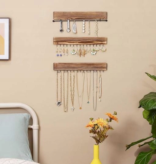 - Украсьте свою стену: благодаря деревенскому оттенку коричневого дерева, романтическим металлическим стержням и элегантным крючкам эти ювелирные вешалки, установленные на стене, характеризуются классическим внешним видом. Повесьте их на стене, заполните драгоценностями и превратите пустую стену в произведение искусства. Повесьте серьги на палке и ожерелья на 30 крючках, и они больше не будут запутаться. Декор красив и летает на встрече с любимым человеком.