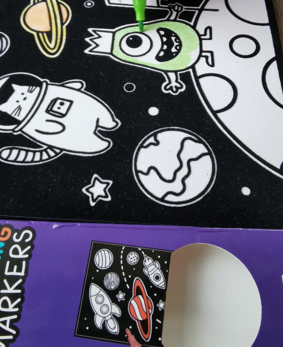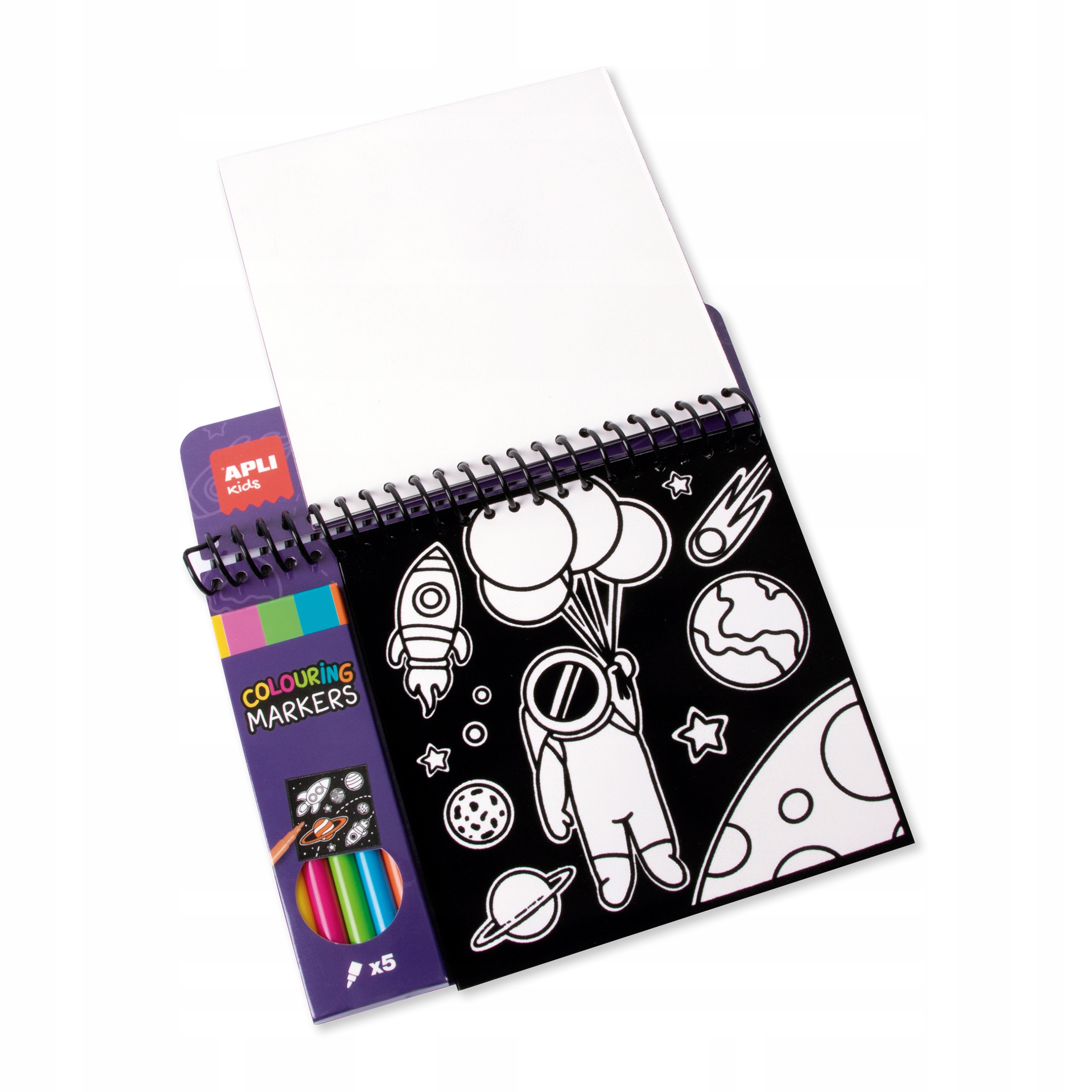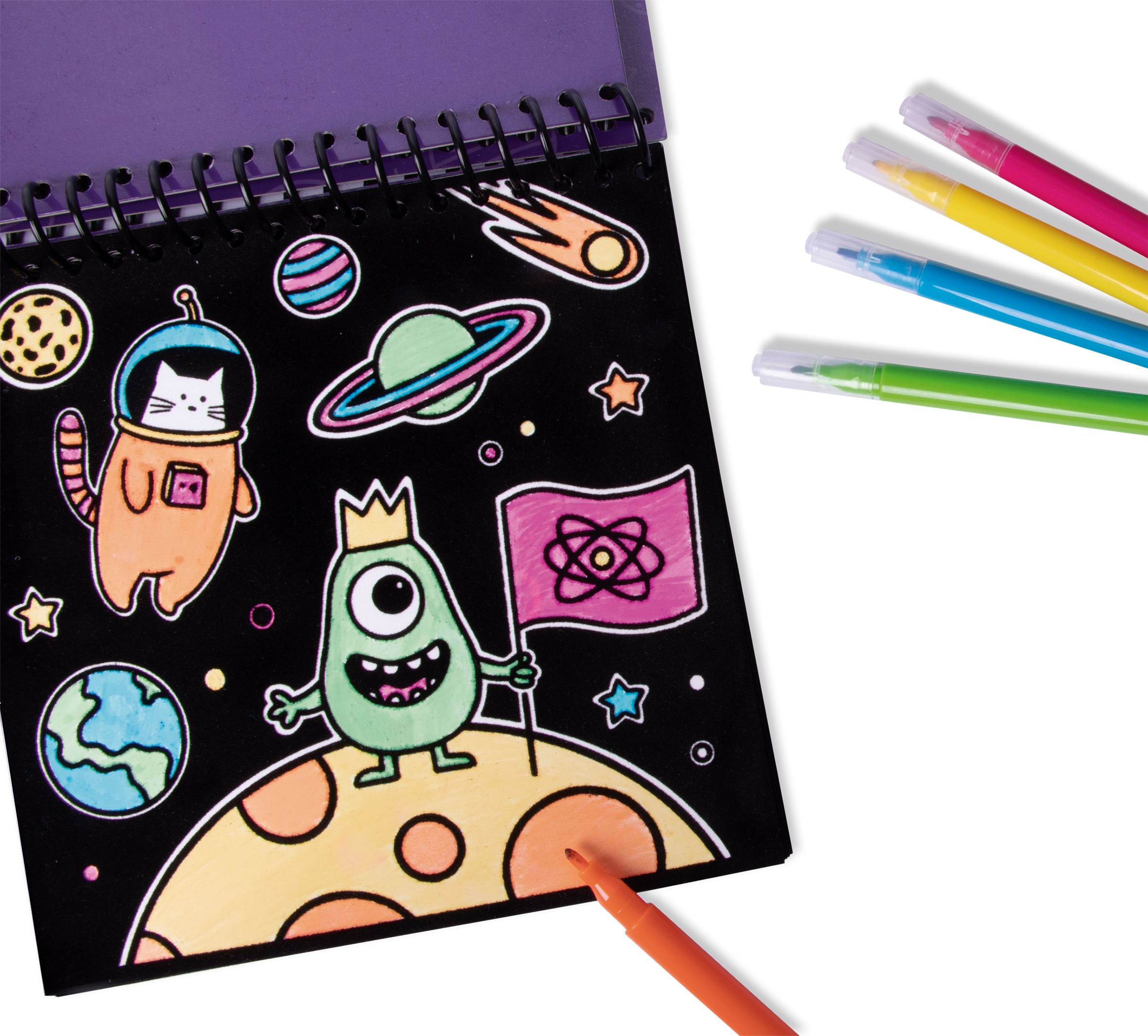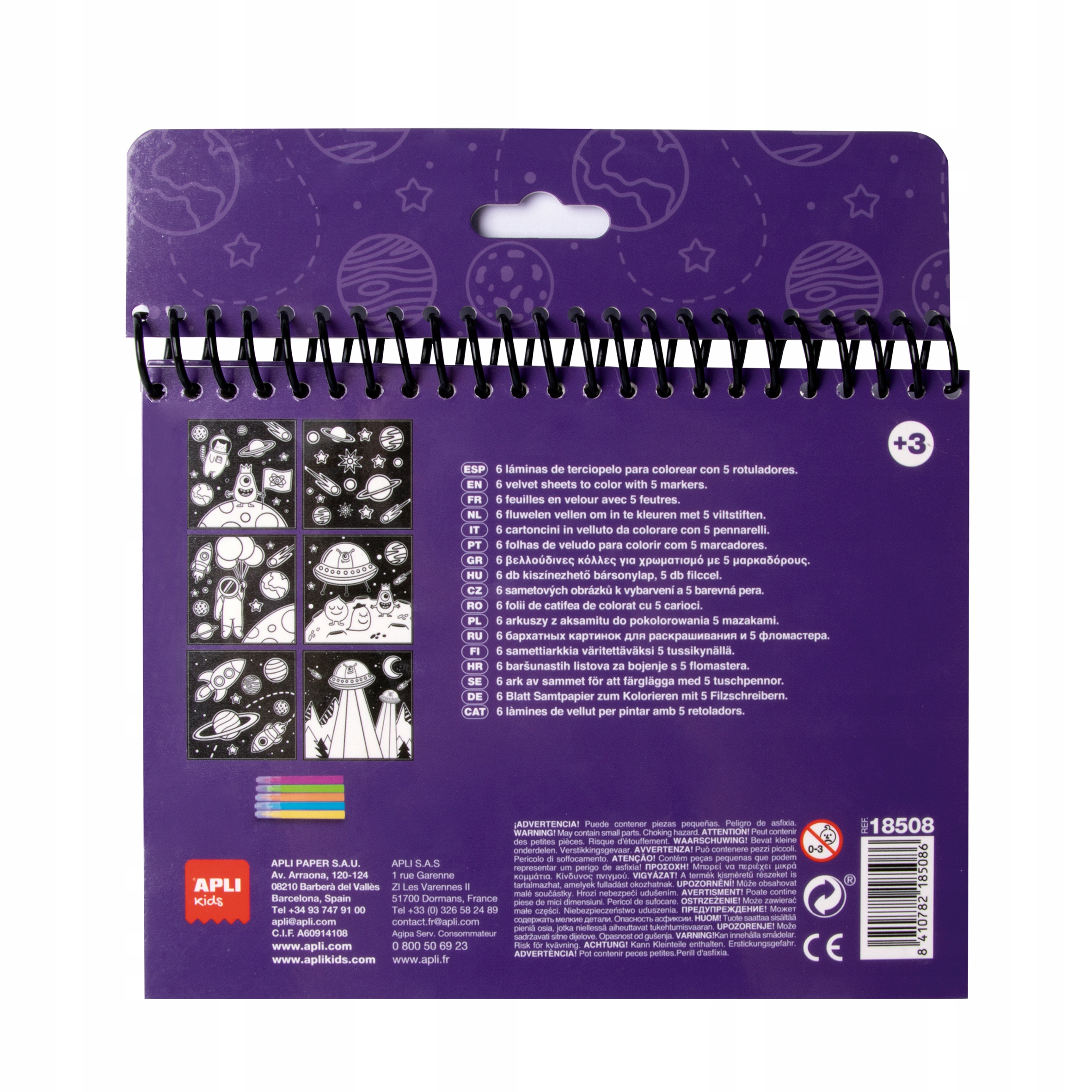 Уникальная раскраска с бархатными элементами детского приложения. Набор включает в себя 5 маркеров: желтый, зеленый, синий, розовый и оранжевый. Контуры иллюстрации сделаны из черного бархата, благодаря тому, что дети могут окрасить пустые места, не опасаясь ошибок. Спиральный светильник делает раскраски идеальной для путешествий, ресторанов или во время посещения бабушки и дедушки. Карандаши всегда будут прикреплены к раскраски, а страницы не будут потеряны.