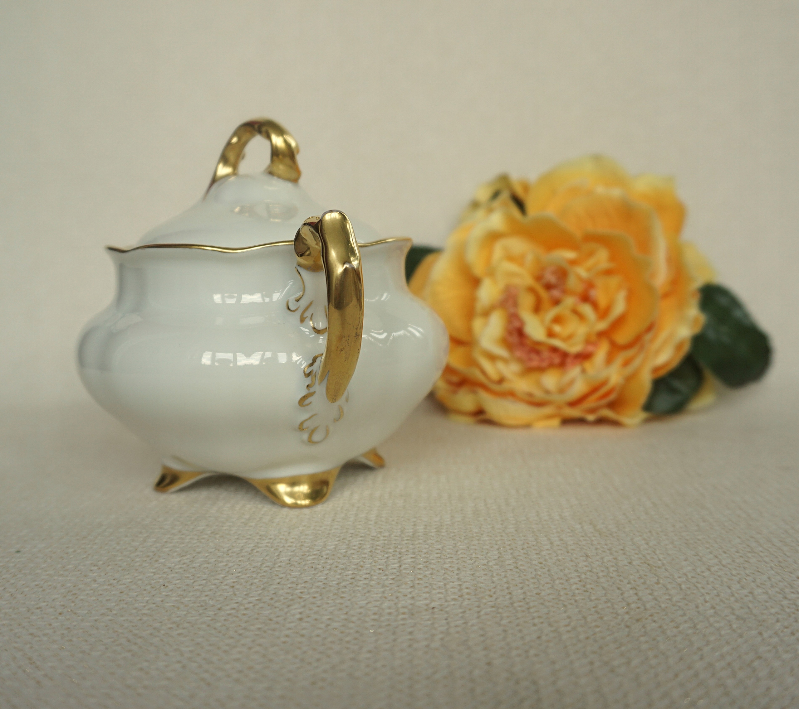 Фарфоровый цвет: белый (да, белый). Эффективная, богатая форма, установленная на четырех стройных ногах. Красивая позолота.