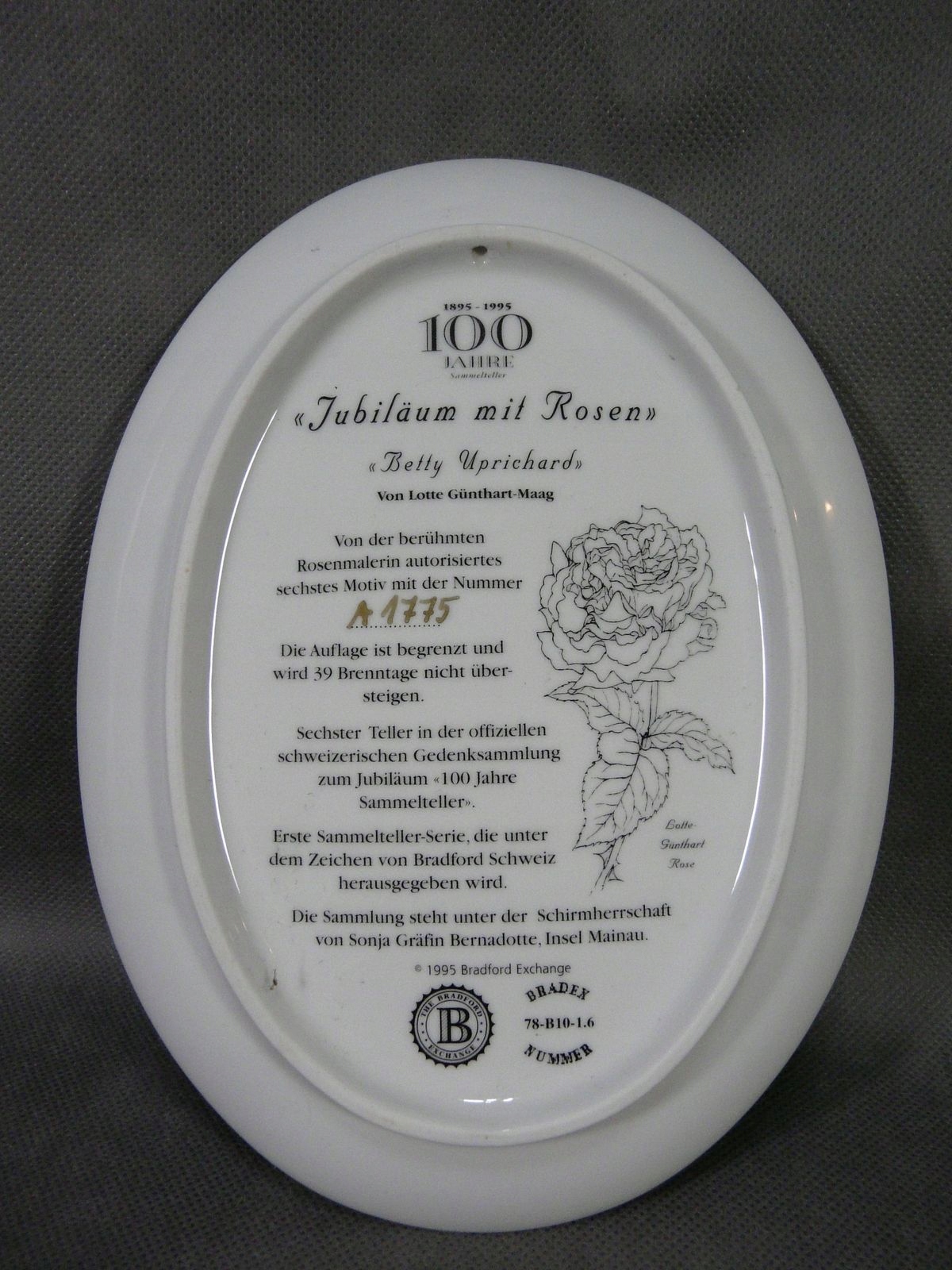 Тарелка 1995 года выпуска, выпущенная к столетнему юбилею издания коллекционных тарелок, включен в международный список BRADEX под номером A 1775