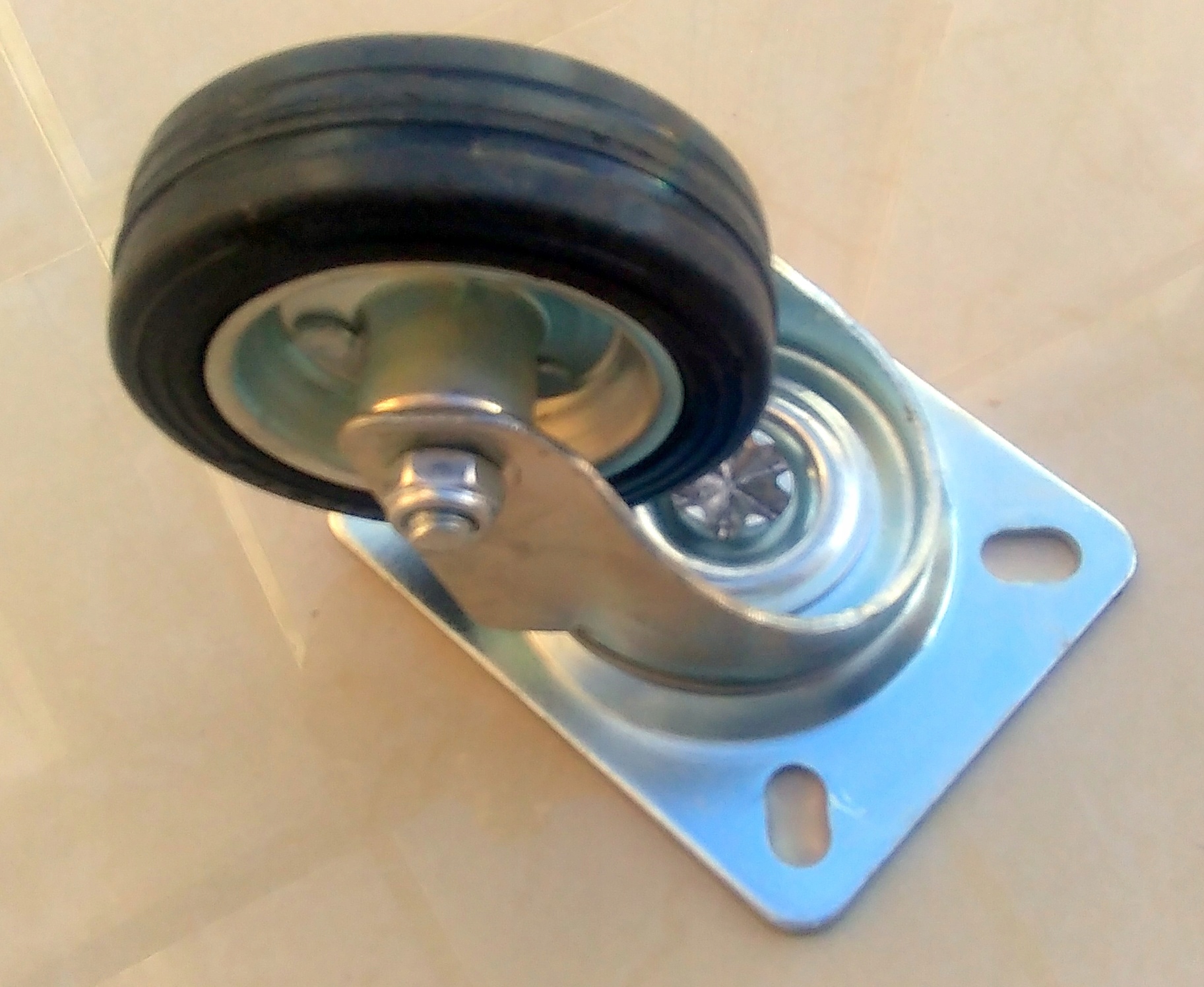 Колеса установлены на так называемых Пластина представляет собой комбинацию вилки из прессованного стального листа, колеса со стальной ступицей и шины из твердой черной резины. Поворотная головка вилки имеет двойные подшипники и защищена от грязи специальным пылезащитным уплотнением. Все металлические элементы комплекта покрыты антикоррозийным хромоцинковым покрытием.