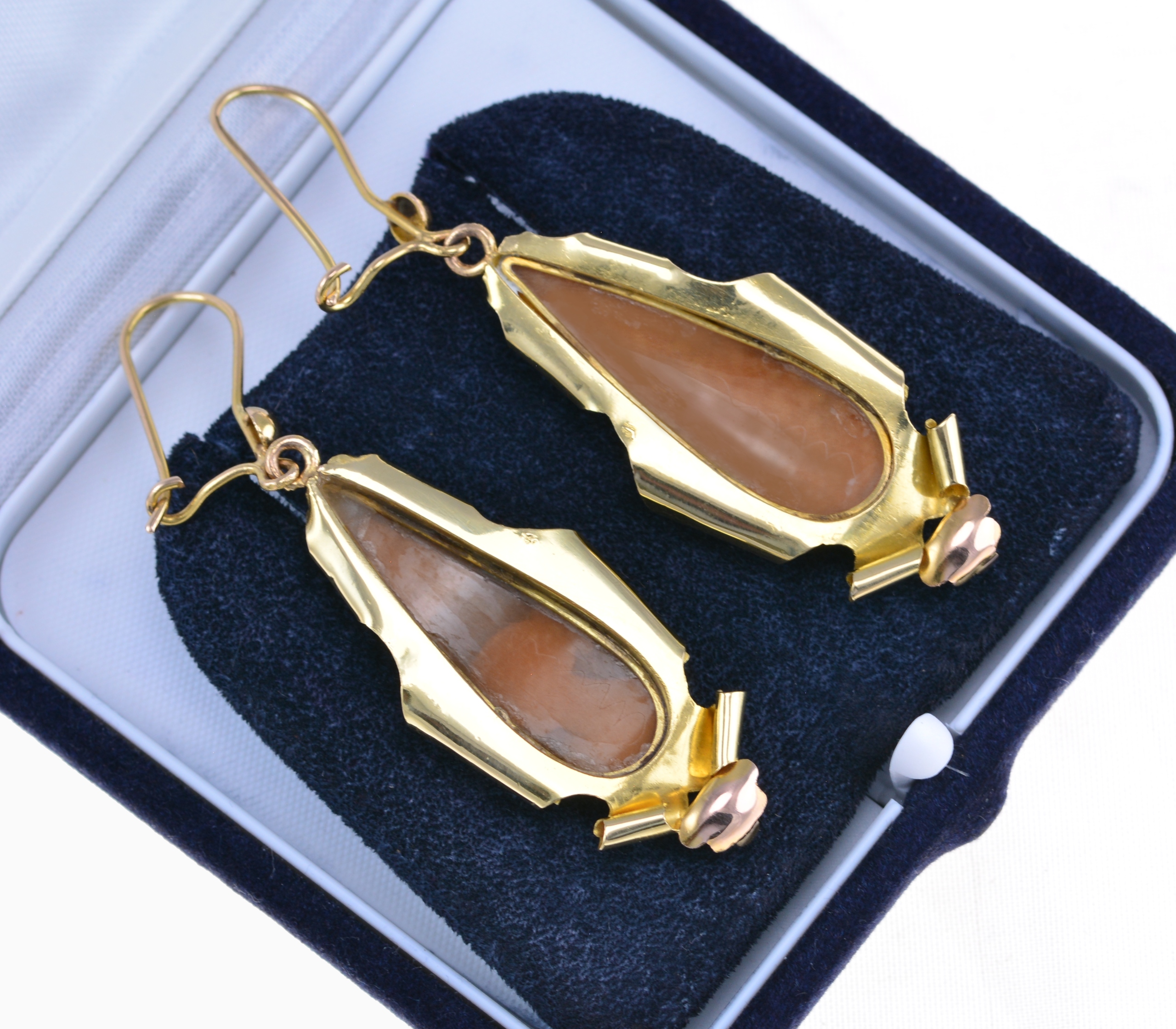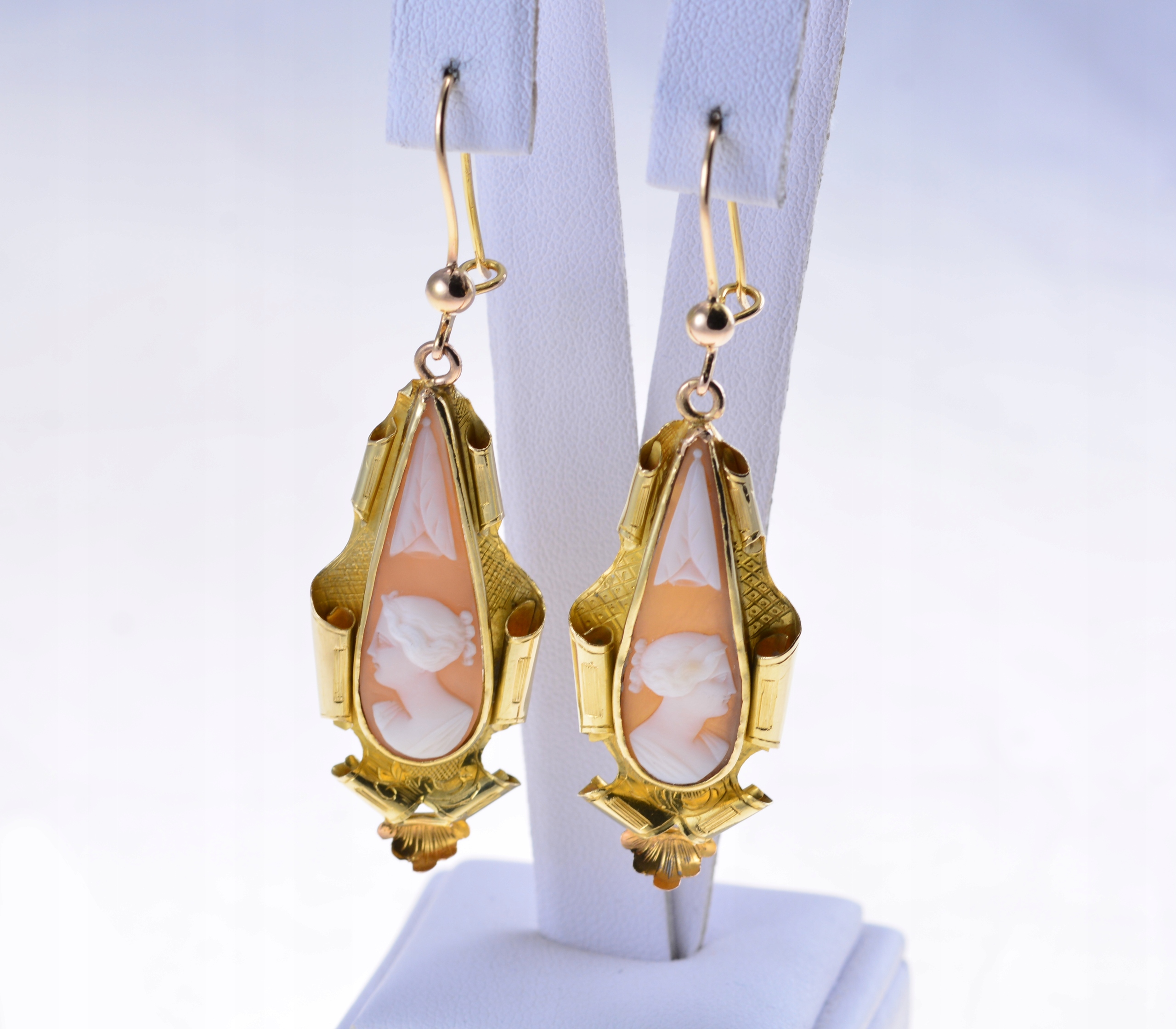 Золотой. Они наслаждаются замысловато вырезанными камерами в раковине. Каждая камера, демонстрируя тонкий женский профиль, создан художественно сформированным золотым рамкой, стиль которого отражает элегантность и мастерство старых ювелирных мастеров.