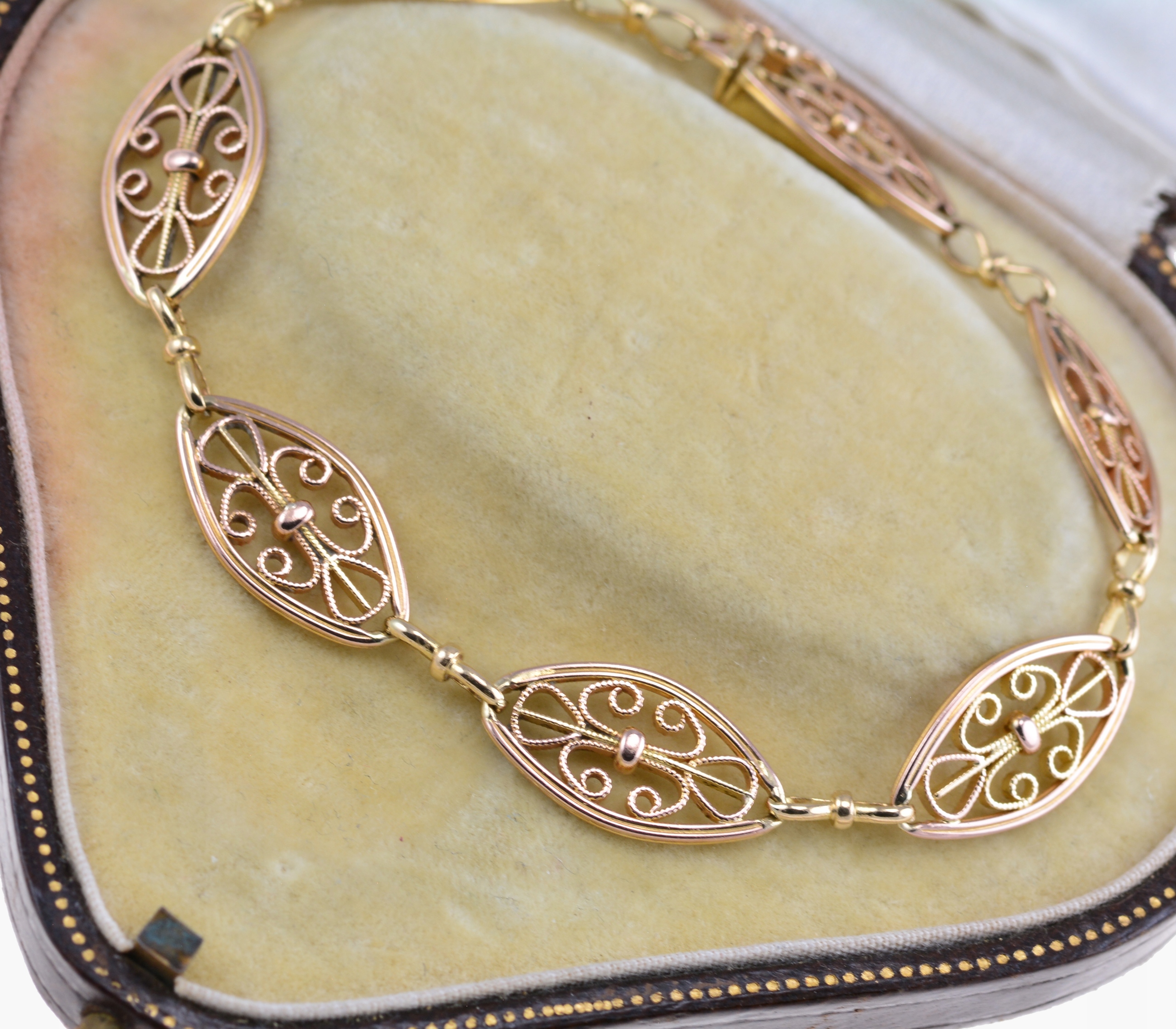 - 750 от 1838-1919. Его деликатная форма состоит из овальных ячеек с открытыми классами, рисунок которых напоминает кружево. 10 мм ширина, застежка ящика.