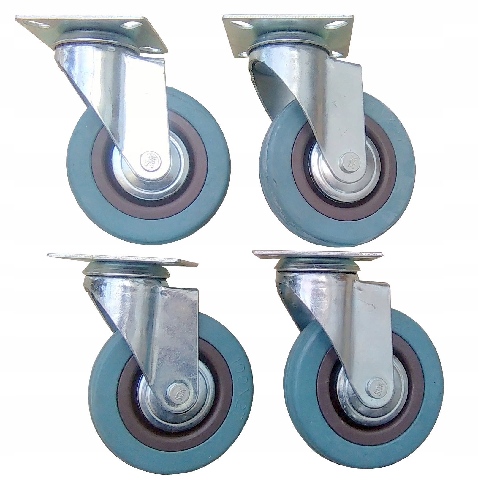 Поворотные колеса, установленные на пластине, представляют собой комбинацию аппаратной вилки из прессованного стального листа. и колесо с полипропиленовой ступицей и шиной из серой немаркой резины. Поворотная головка вилки имеет двойные подшипники.