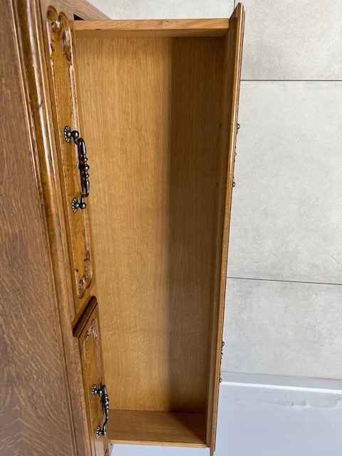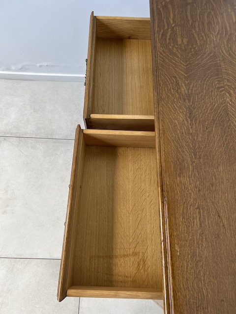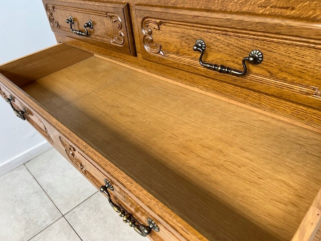 Дубовый комод, бельевой шкаф. Он выполнен в стиле Людвика. Имеет пять вместительных ящиков. Единственный недостаток - сильно поцарапанный верх. Других повреждений и дефектов нет. Внутри ящики аккуратные и чистые. Он готов к вставке.
