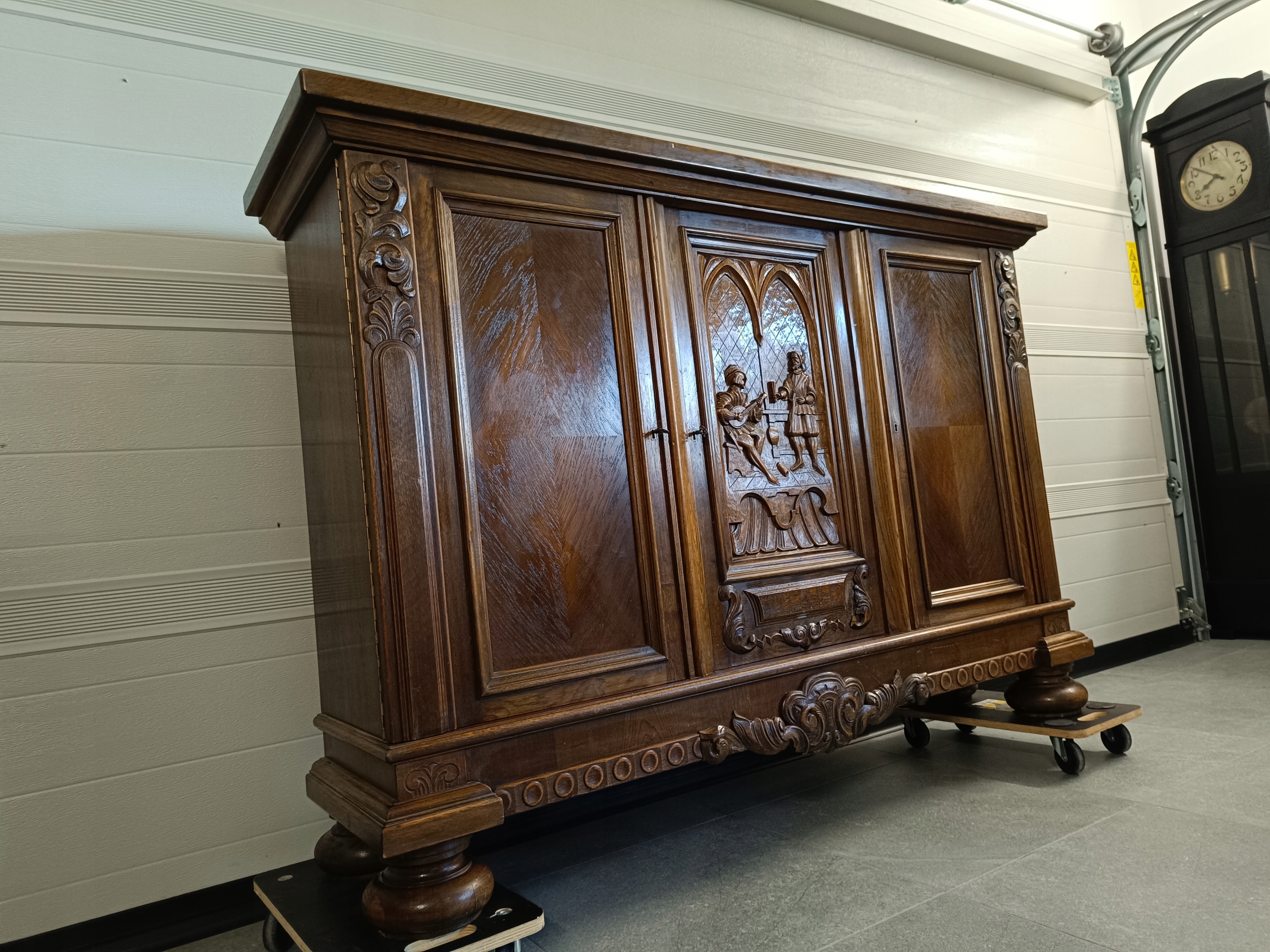 комод с многочисленной резьбой из дерева вручную, датированной 1940-1950 годом.