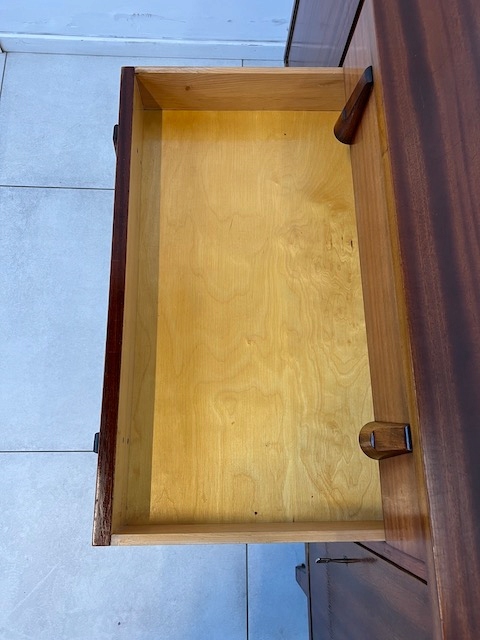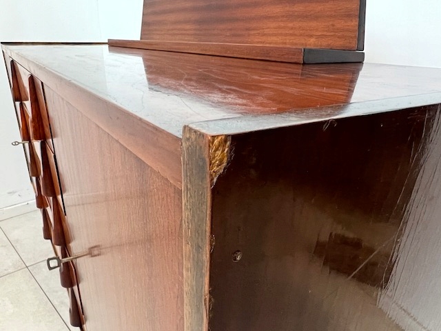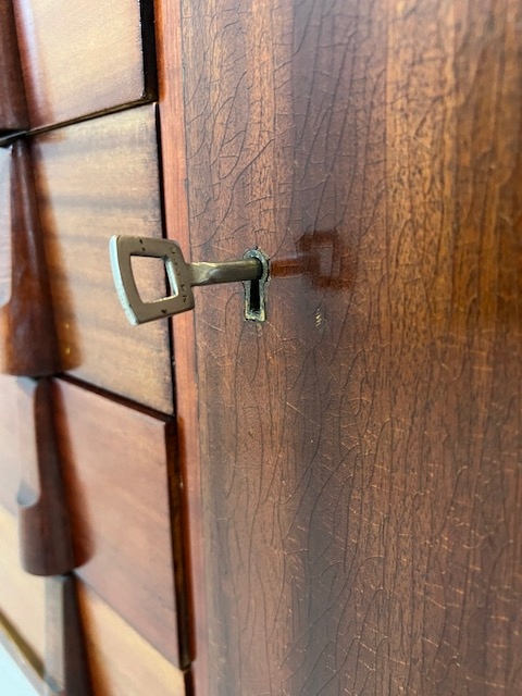 Представленный здесь комод в целом находится в хорошем состоянии. Он изготовлен из столярного картона, шпонированного красным деревом и покрытого лаком. Имеет следы использования; мелкие ссадины. Самым большим недостатком может быть потрескавшийся лак. Он виден под прямым углом, но царапин под пальцами не чувствуется. Замки функциональные, с набором ключей. Внутри комод ухожен. Комод готов к установке.