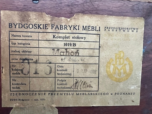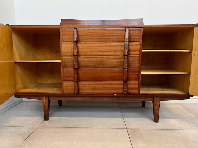 Модернистский, винтажный комод времен Польской Народной Республики. Он входил в состав известного столового сервиза 1019. Это был комплект мебели из красного дерева для гостевой комнаты. Его спроектировал познаньский дизайнер интерьеров Раймунд Теофил Халас – один из самых плодовитых дизайнеров мебели, внедренных в производство во времена Польской Народной Республики. Его производили на Быдгощской мебельной фабрике, принадлежащей Союзу мебельной промышленности в Познани. Тип 1019 включал в себя представленный здесь комод, витрину и стол с набором стульев. У нас есть комод и витрина. Набор был разработан и изготовлен в 1962 году. Он был экспортирован как набор MARKO.