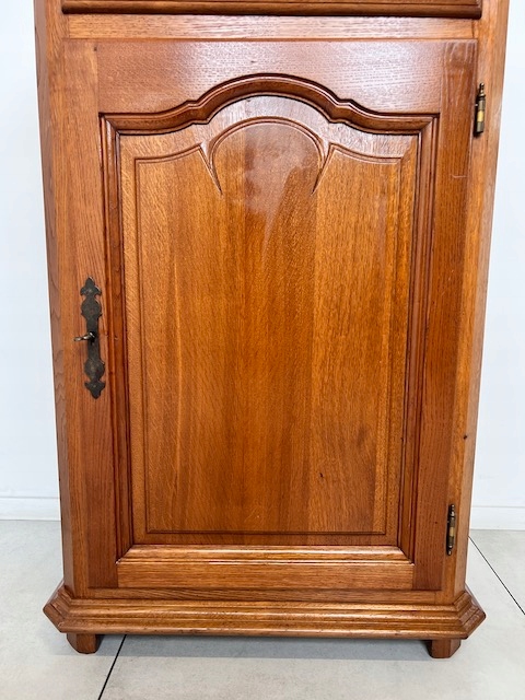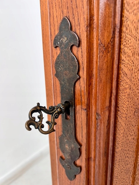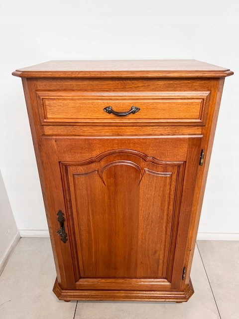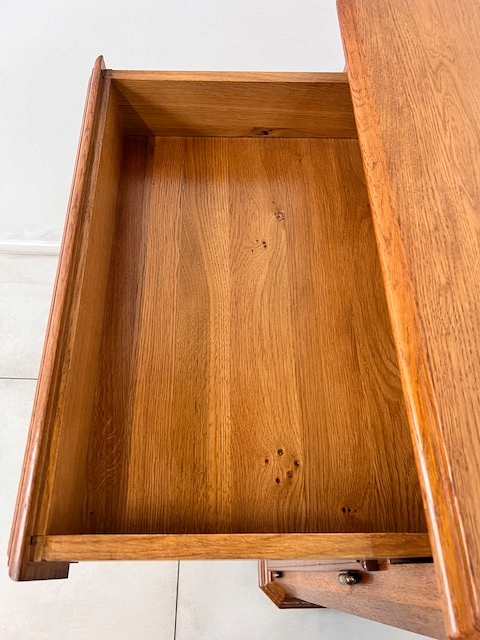 Комод из массива дуба. Он в хорошем состоянии, ухоженный. Внутри шкафа имеются две полки, высоту которых можно свободно регулировать. Замок функциональный, в комплекте есть ключ. Комод сделан добротно. Это тяжело. Готово к вставке.