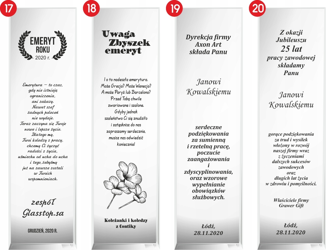 На выбранном вами продукте мы можем подготовить любую гравировку для вас для каждого случая: день рождения, день имени, крещение, причастие, восемнадцать, выпускной или другой случай. Мы привлекаем любой - предоставленный клиентом text (в редактируемой форме - ноутбука), а также на иностранном языке (после предоставления переведенного текста).