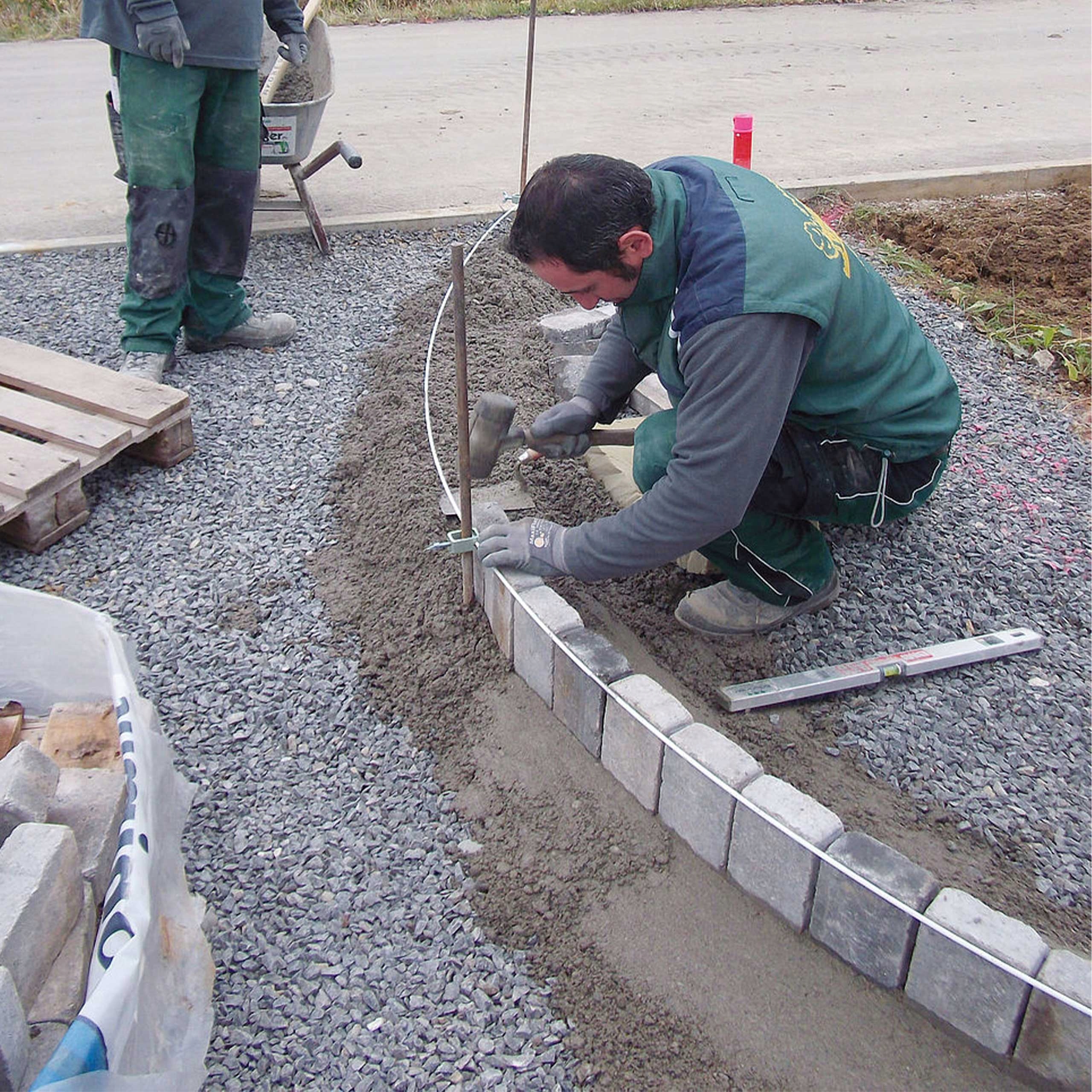 В случае краев дорожек и клумб используется так называемый однослойный в сухом бетонном основании.