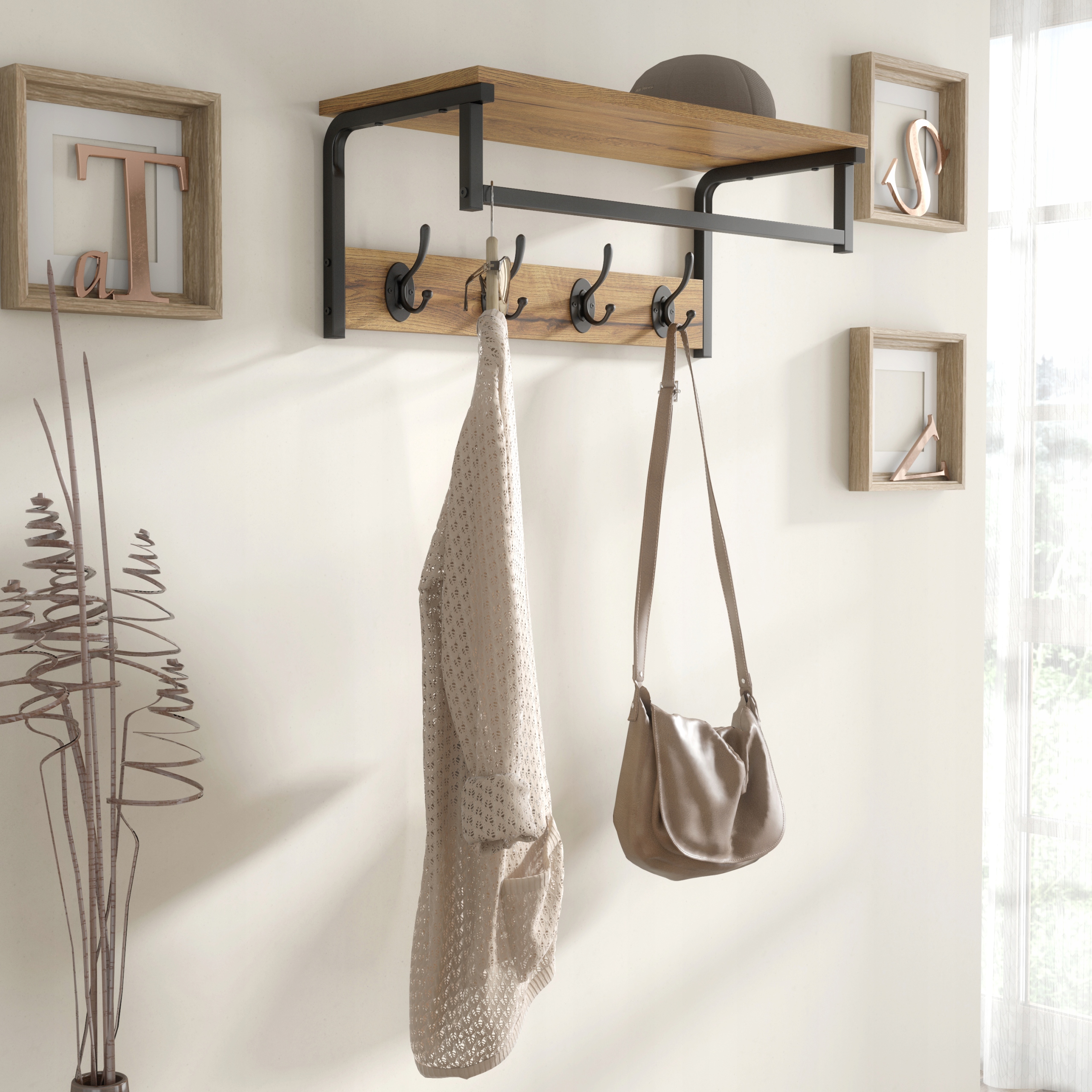 Простая и в то же время восхитительная настенная вешалка, которая идеально впишется в нашу прихожую. Сочетание цвета мебельного щита из натурального дуба с черным цветом металла делает эту мебель вневременной, подходящей как к современному, минималистическому интерьеру, так и к интерьеру в стиле лофт. Верхняя часть идеально подходит в качестве полки для головных уборов или перчаток, а нижнюю можно легко использовать для подвешивания верхней одежды и сумок. Мебель изготовлена из качественного ламинированного картона толщиной 15 мм, обеспечивающего долговечность.
