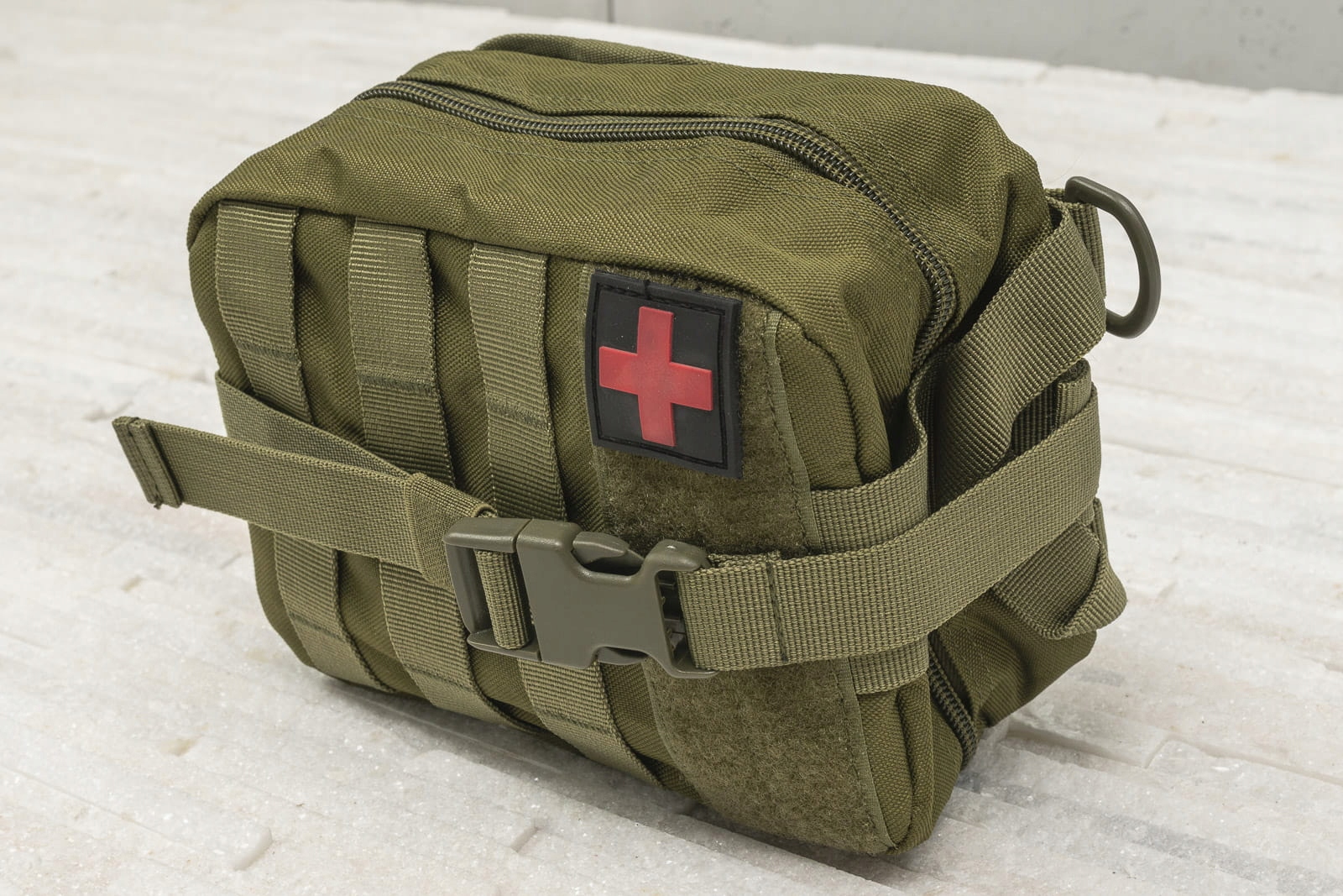 Изделие изготовлено из прочного материала (Полиэстер 600D), устойчивого к погодным условиям. Аптечка закрывается на молнию. Значок Красного Креста крепится на липучке и легко снимается.