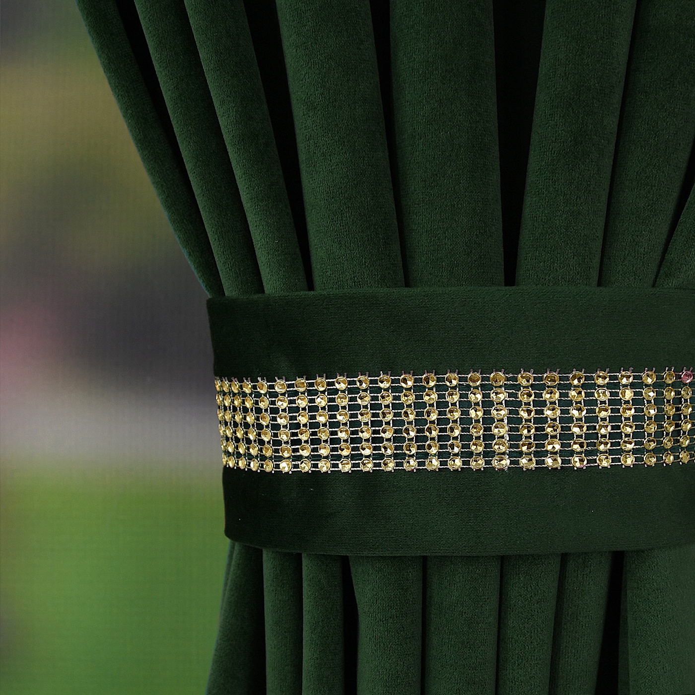 Штора – настоящая жемчужина этого комплекта. Украшенный золотыми цирконами, сияющими как настоящие бриллианты, он становится центральным декоративным элементом, притягивающим взгляды и придающим исключительную элегантность. Нежный гипюр, украшающий края штор, придает им легкость и ажурность, создавая гармоничную композицию с велюровыми шторами.