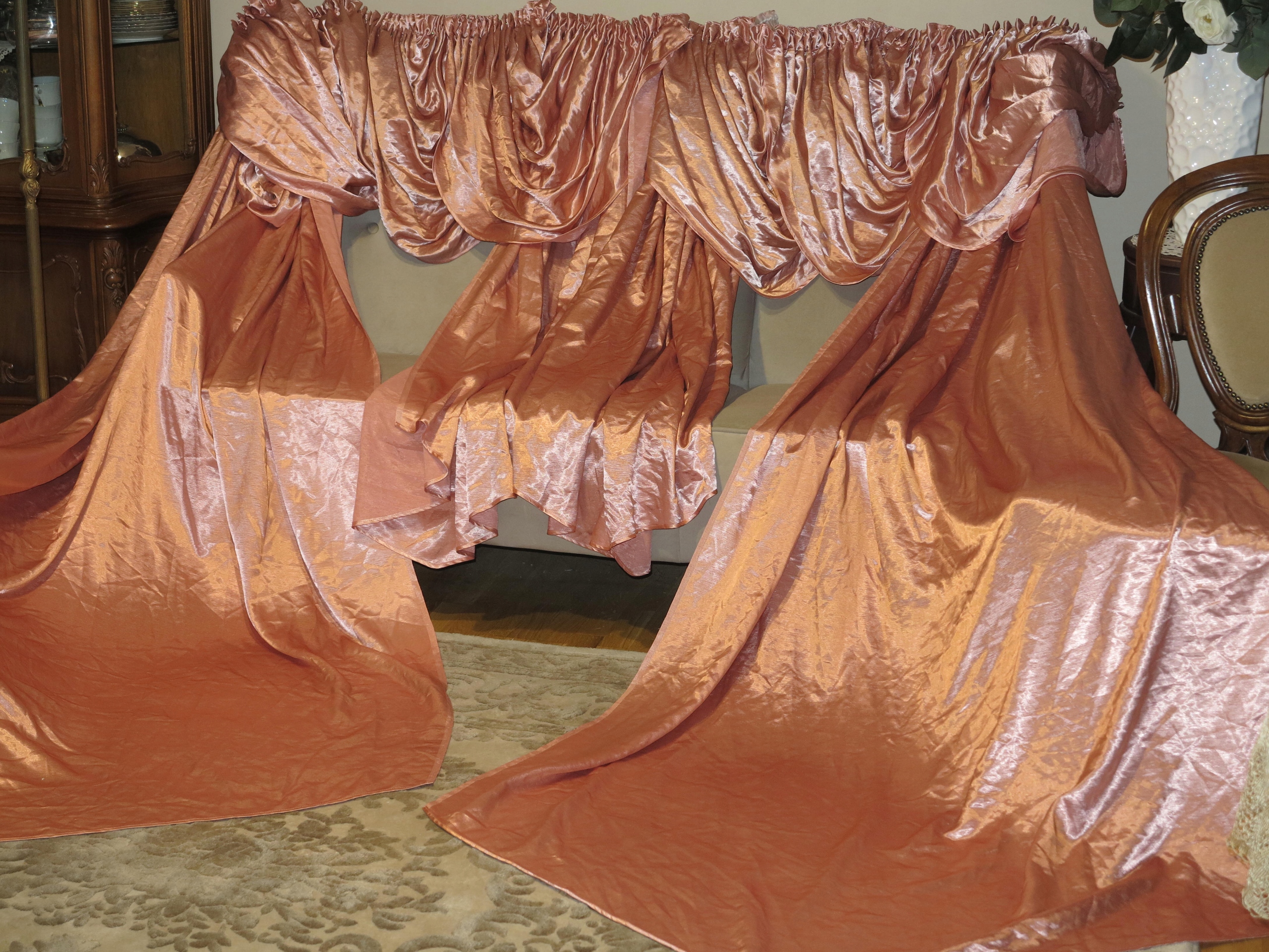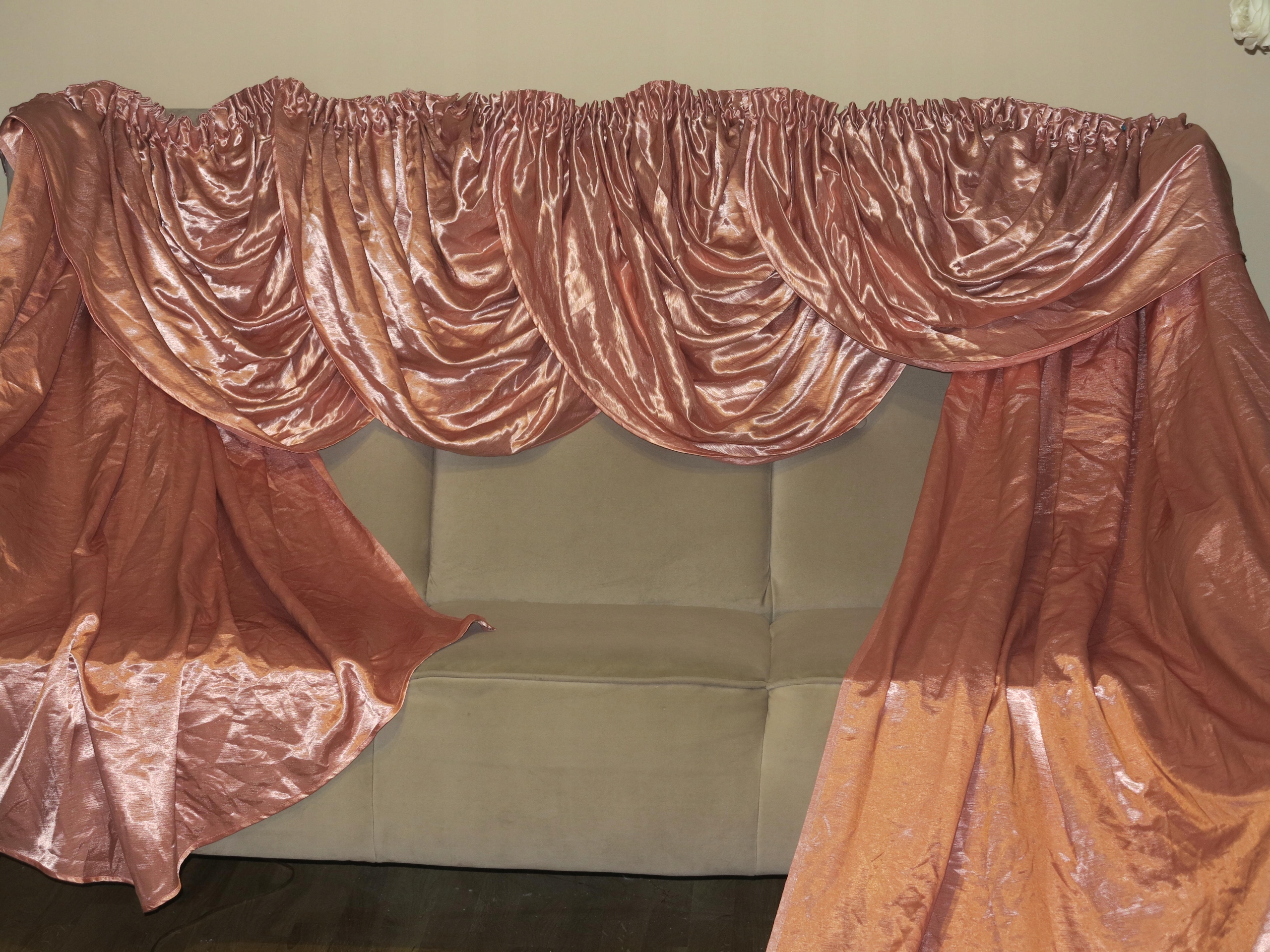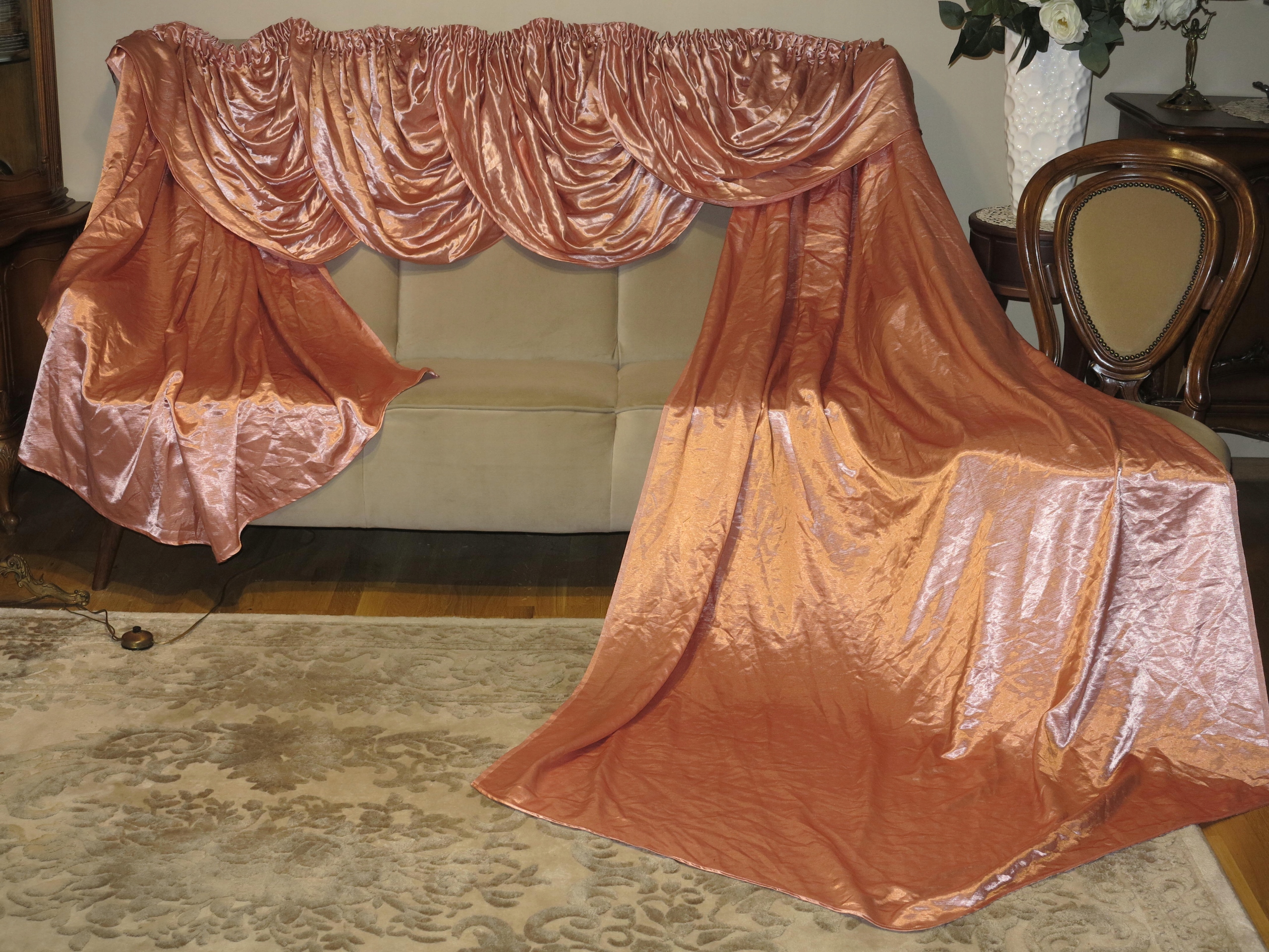 КОМПЛЕКТ ИЗ ДВУХ РАСПОЛОЖЕННЫХ ШТОР ДЛЯ ШИРОКОГО ОКНА. КАЖДАЯ ЗАНАВЕСА НАДЕЖНО ПРИСОЕДИНЕНА К 4 ВЕРХНИМ ВОДНЫМ ПЛЮС ПОДВЕСНЫМ ЦЕНТРАМ КОРОТКИМ СТОРОНАМ - ЗАВЯЗКАМ. ЦВЕТ ЛОСОСЬ