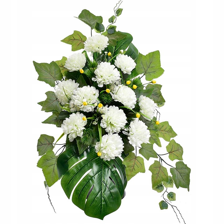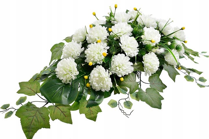 ✅ Украшение состоит из чудесных цветов хризантем и множества белых и зеленых аксессуаров.