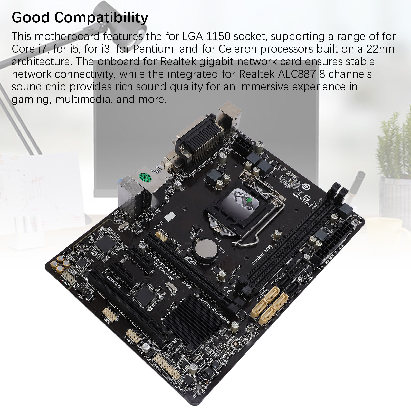 1. Хорошая совместимость: эта материнская плата содержит гнездо LGA 1150, поддерживающая i7 для i5 для i5 для i3, для Pentium и для процессоров Celeron, построенных на 22 нм архитектуры. Встроенная сетевая карта Realtek Gigabit обеспечивает стабильную сетевую подключение, в то время как интегрированная звуковая система Ealltek Alc887 8 каналов обеспечивает богатое качество звука для игр для привыкания в играх, мультимедиа и многих других.