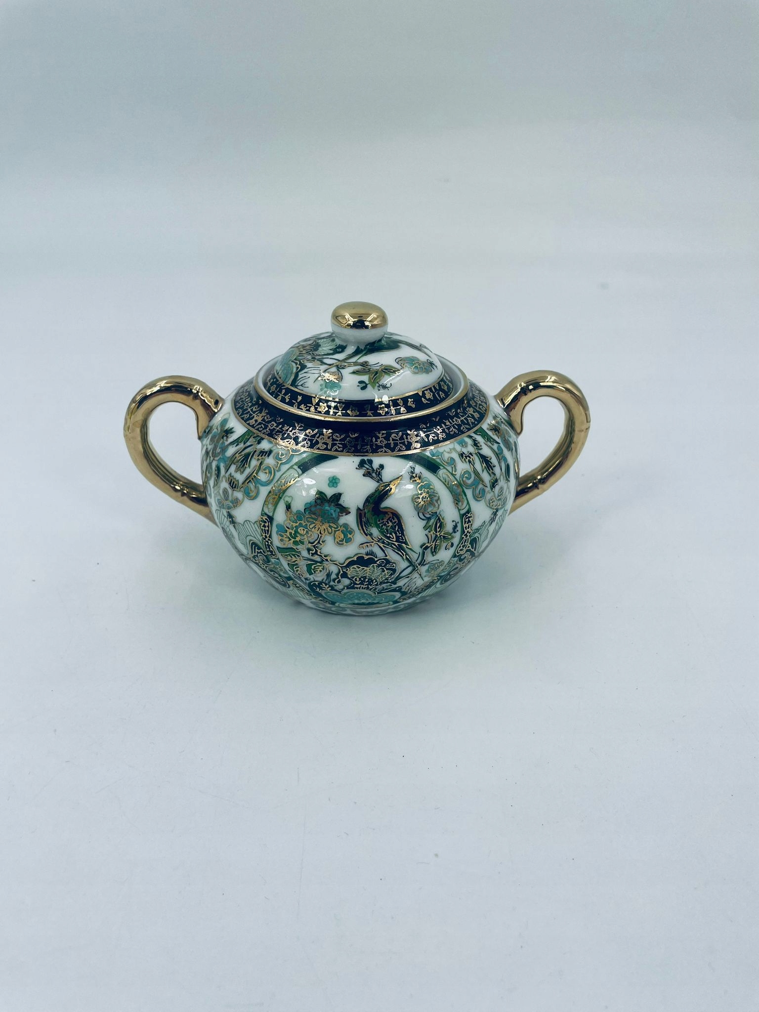 Saji Japan Изящная китайская сахарница. Зеленый фарфор с золотым стаффажем. Мотив сахарницы – круглый медальон с павлином, окруженный цветочным орнаментом и декоративными мотивами. Фарфор, расписанный вручную.