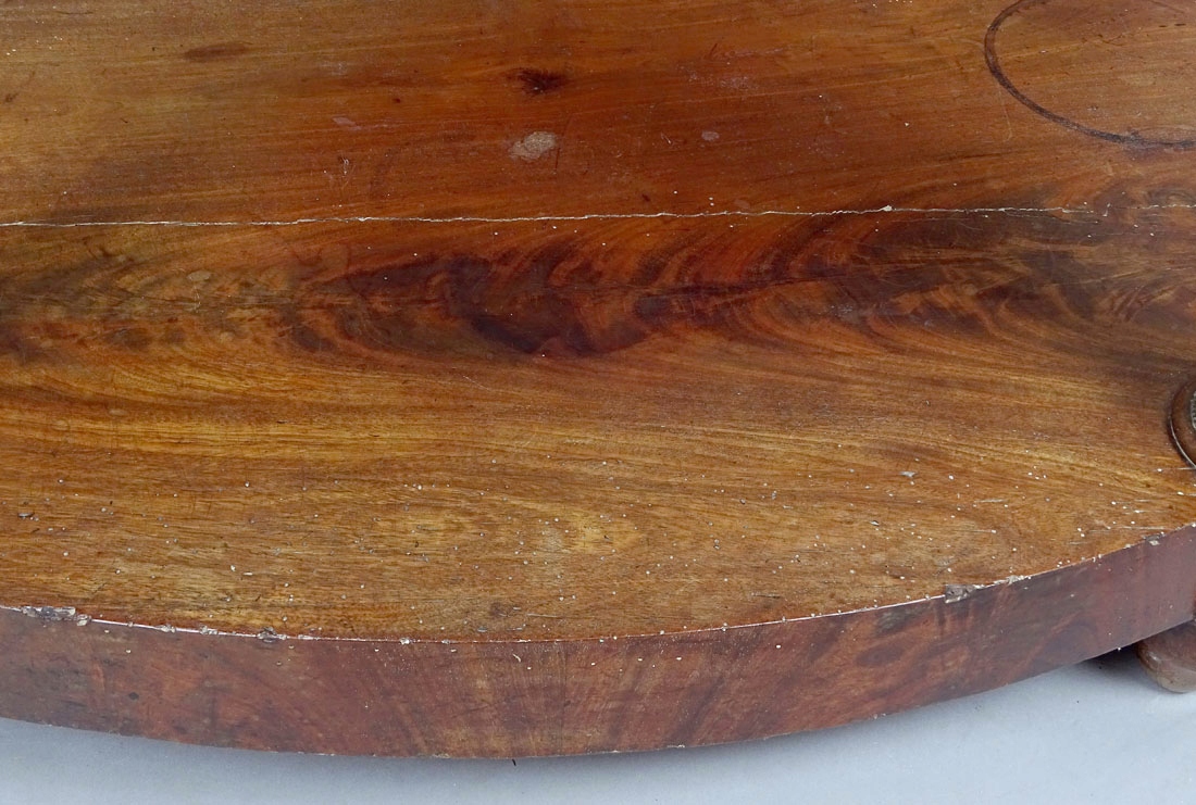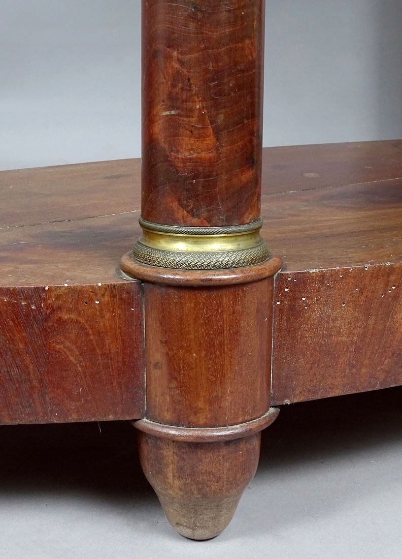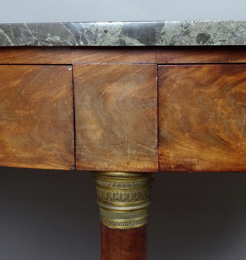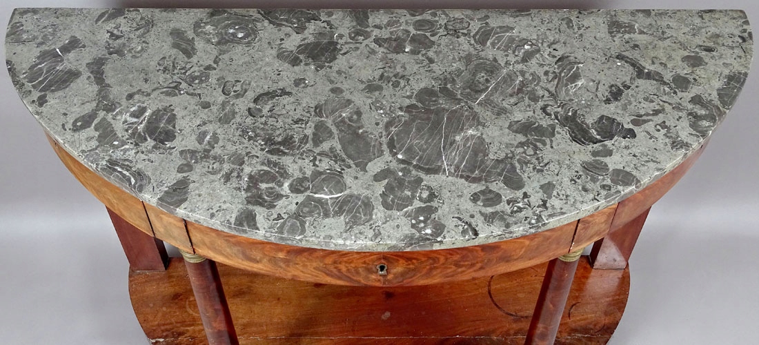 выгнутая спереди и прямая сзади, опирается на четыре ножки, передняя часть повернута, задняя угловая. Каркас положен на две суживающиеся кверху колонны, украшенные гравированными бронзовыми аппликациями, с широкими угловыми кронштейнами с обеих сторон сзади. Сверху мраморная столешница, снизу три ящика: один широкий посередине и два поменьше по бокам. Каждый из них имеет стальной замок и латунный ключ спереди.