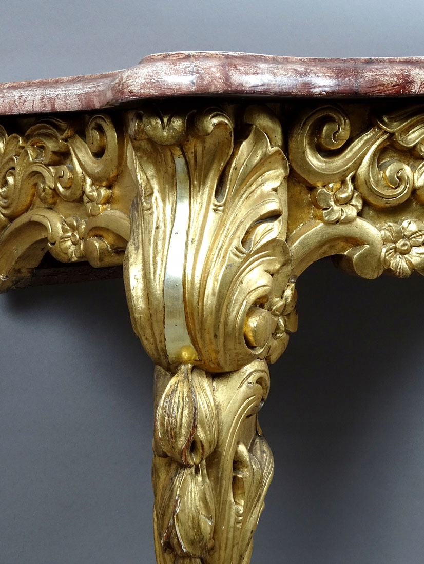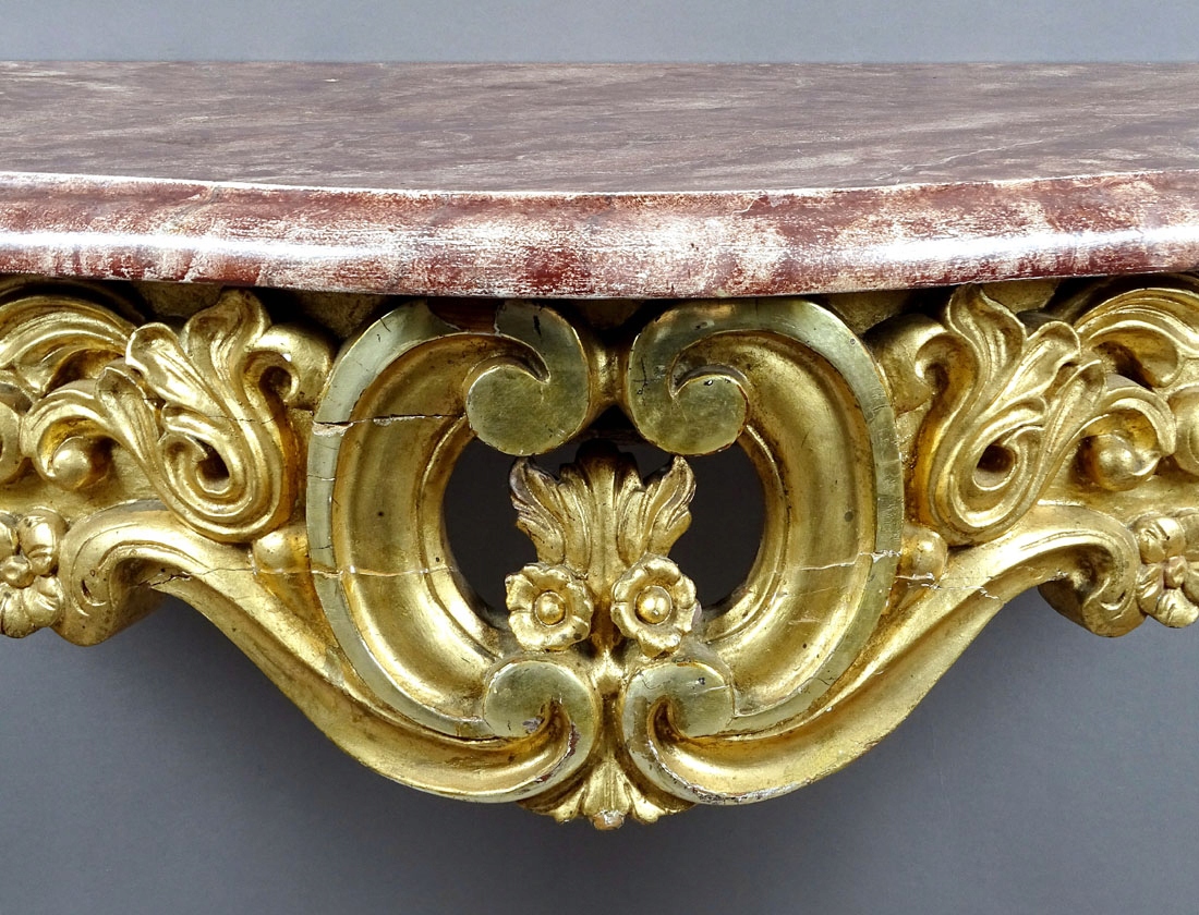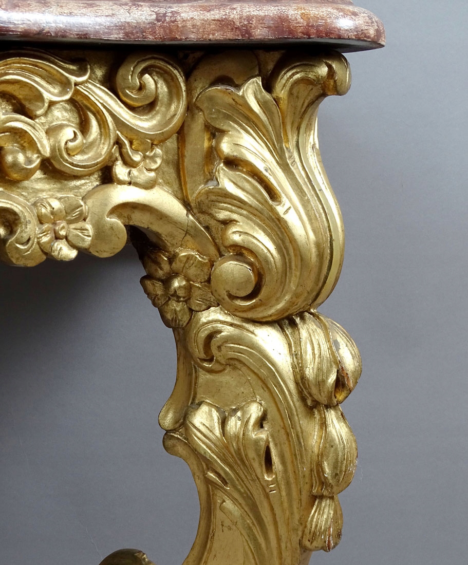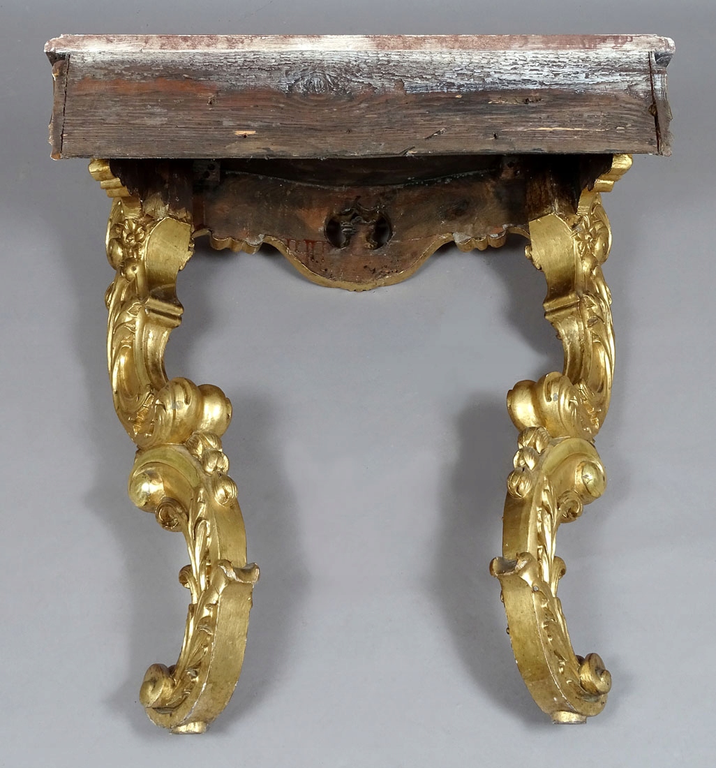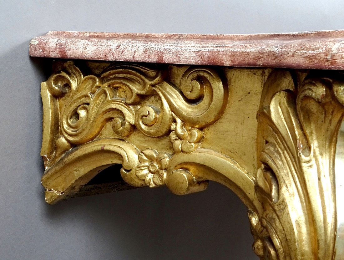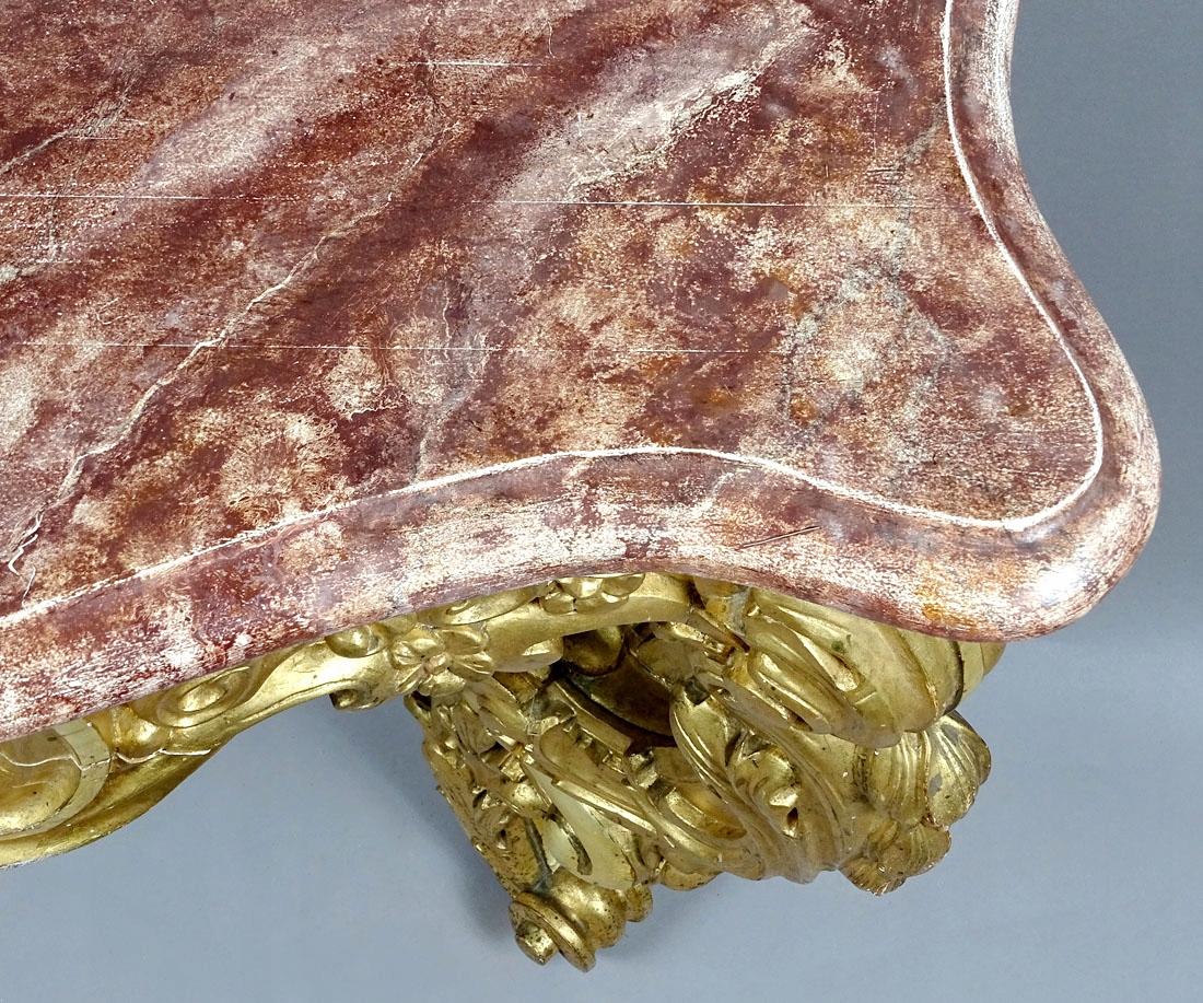 Консоль в стиле рококо, с двумя изогнутыми, очень богато резными, позолоченными ножками. Украшения на ножках в виде листьев аканта, маленьких цветочных чашечек и узоров рокайль, а также передней ажурной полоски. Вверху столешница, немного выступающая за контур консоли, скошенная, из дерева с имитацией мрамора.