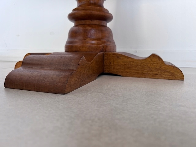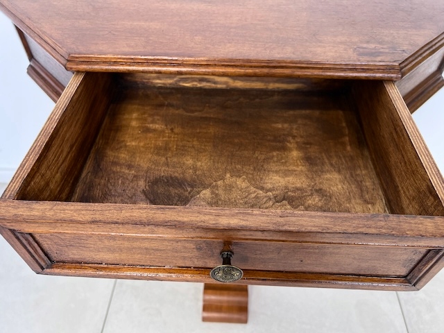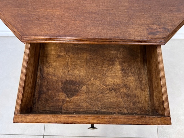 Консоль с выдвижным ящиком. Очень хорошенькая. Столешница трапециевидной формы. Под ним есть ящик. Он находится в хорошем состоянии. Кроме небольшого дефекта на столешнице, других повреждений и дефектов нет. Имеет типичные следы использования. Консоль готова к вставке.