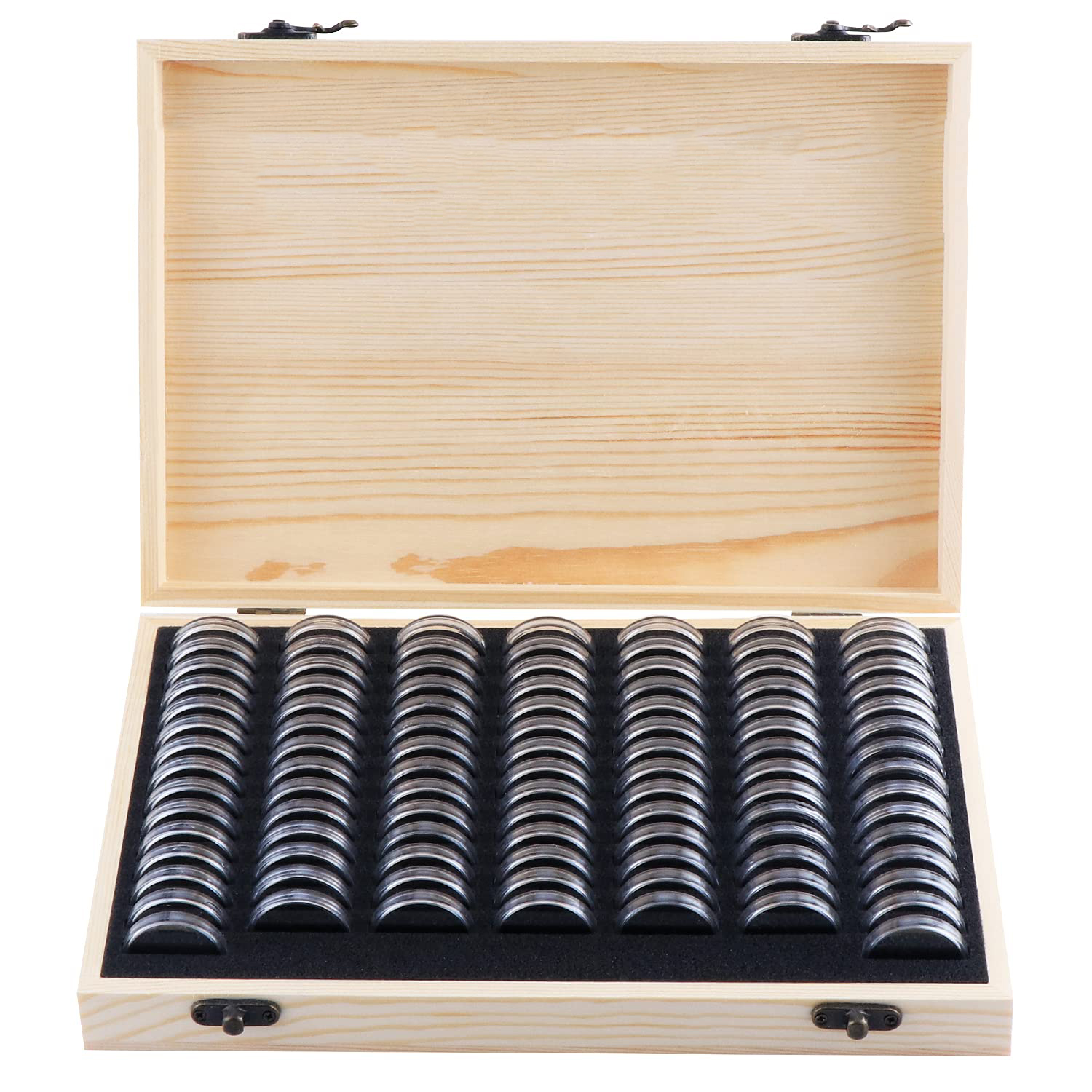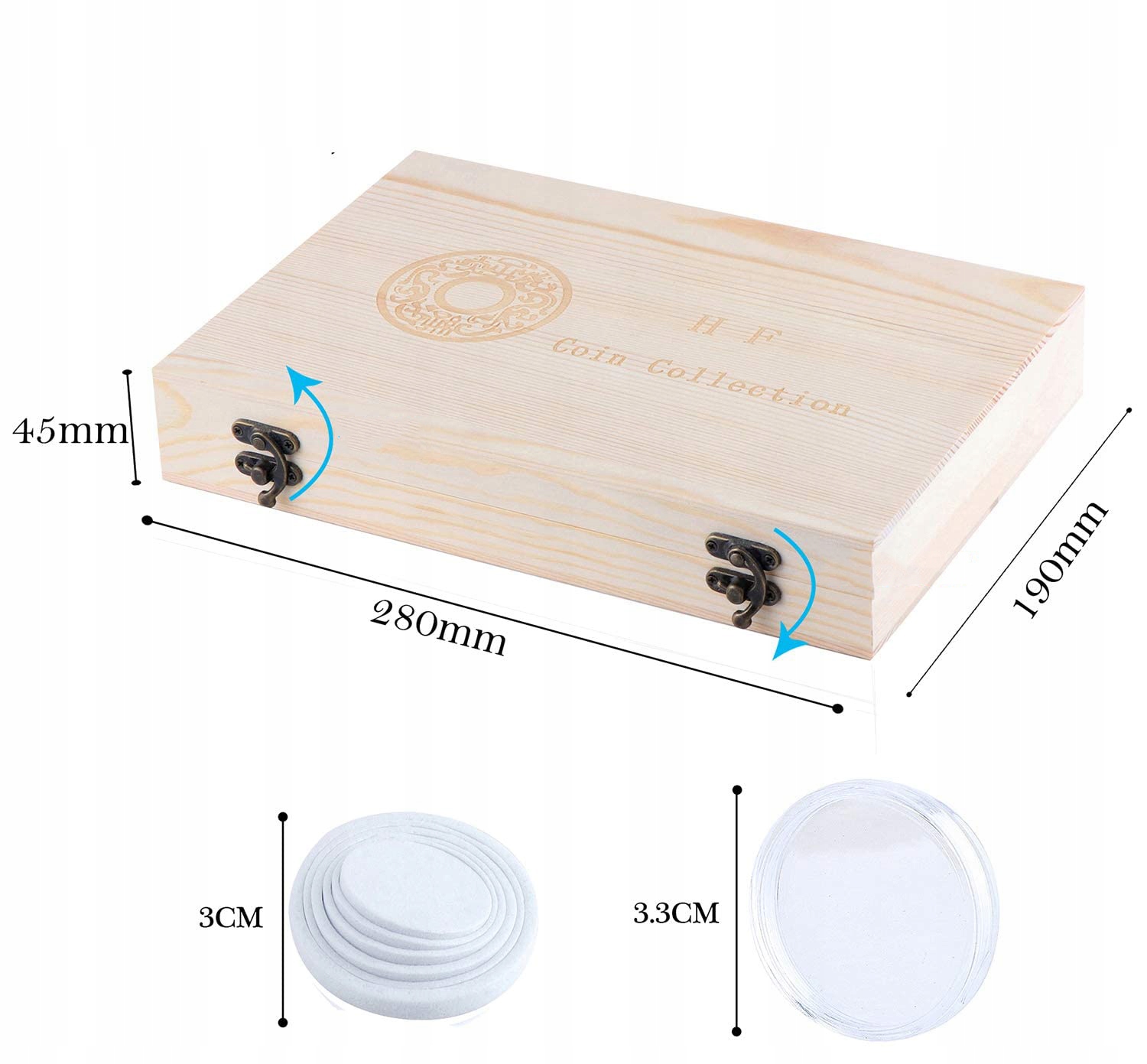 Ящик для сбора монет изготовлен из древесины сосны высочайшего качества с полированной поверхностью, размеры которого примерно 28*19*4,5. см (100 шт.), вмещает 100 шт. пластиковых капсул для монет, практичных и прочных, идеально подходящих для сбора монет разных размеров.
