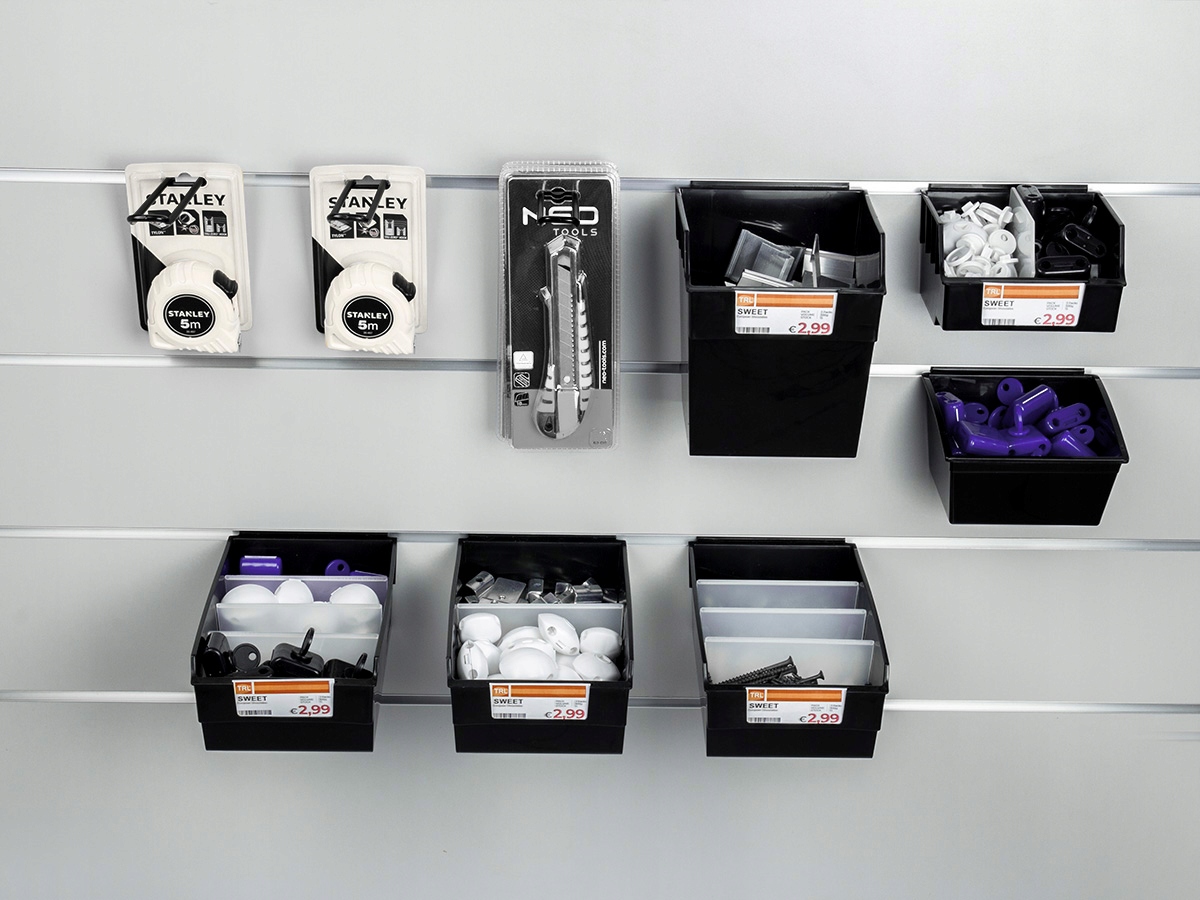 Высокий контейнер TOP для системы Spacewall, ширина 15 см, глубина 15 см и высота 18 см. Изготовлен из пластика – кристаллического полипропилена. На передней части контейнера имеется место для этикетки с описанием или ценой. Размеры этикетки 76x35 мм.