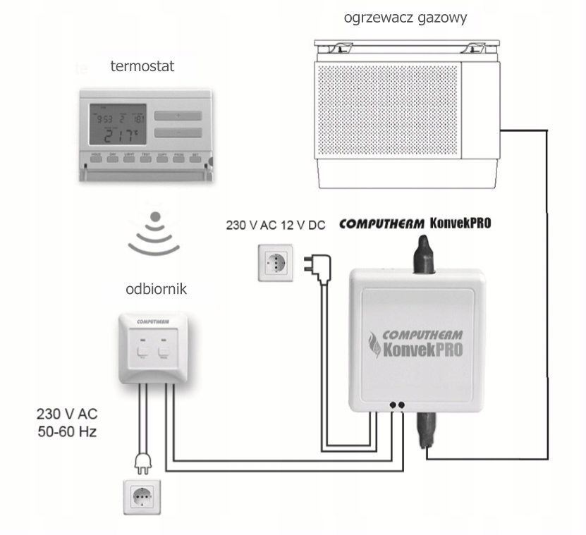 Когда комнатная температура падает ниже значения, установленного на термостате комнаты, konvekpro на основе сигнала, полученного из комнатной термостата 3-6 минут) ниже температуры установил ручку, установленную регуляторным газовым обогревателем так, чтобы газовый обогреватель включался и начинал нагреваться. Когда температура комнаты достигает значения, установленного на термостате комнаты, термостат комнаты посылает сигнал konvekpro, так что он согревает (в течение 1-1,5 минуты) трубчатый термостат над значением, установленным с ручкой регулировки газового нагревателя и газового нагревателя .. Кроме того, этот продукт позволяет дистанционному управлению газовыми нагревателями с помощью термостата Wi-Fi. Благодаря этому продукту вы можете сэкономить значительное количество энергии и улучшить комфорт. Мы разработали Konvekpro только для газовых обогревателей. Тем не менее, устройство может работать с газовыми обогревателями нескольких производителей, которые содержат газовый клапан трубчатого термостата (CR6 или Eurosit 630), аналогичный термостату Fég. Один термостат может управлять более чем одним газовым обогревателем и так много устройств ConpekPro, мы хотим контролировать со многими газовыми обогревателями. Если вы хотите контролировать нагрев, вам нужен один беспроводной термостат, и для каждого газового радиатора необходимо только 1 беспроводной приемник