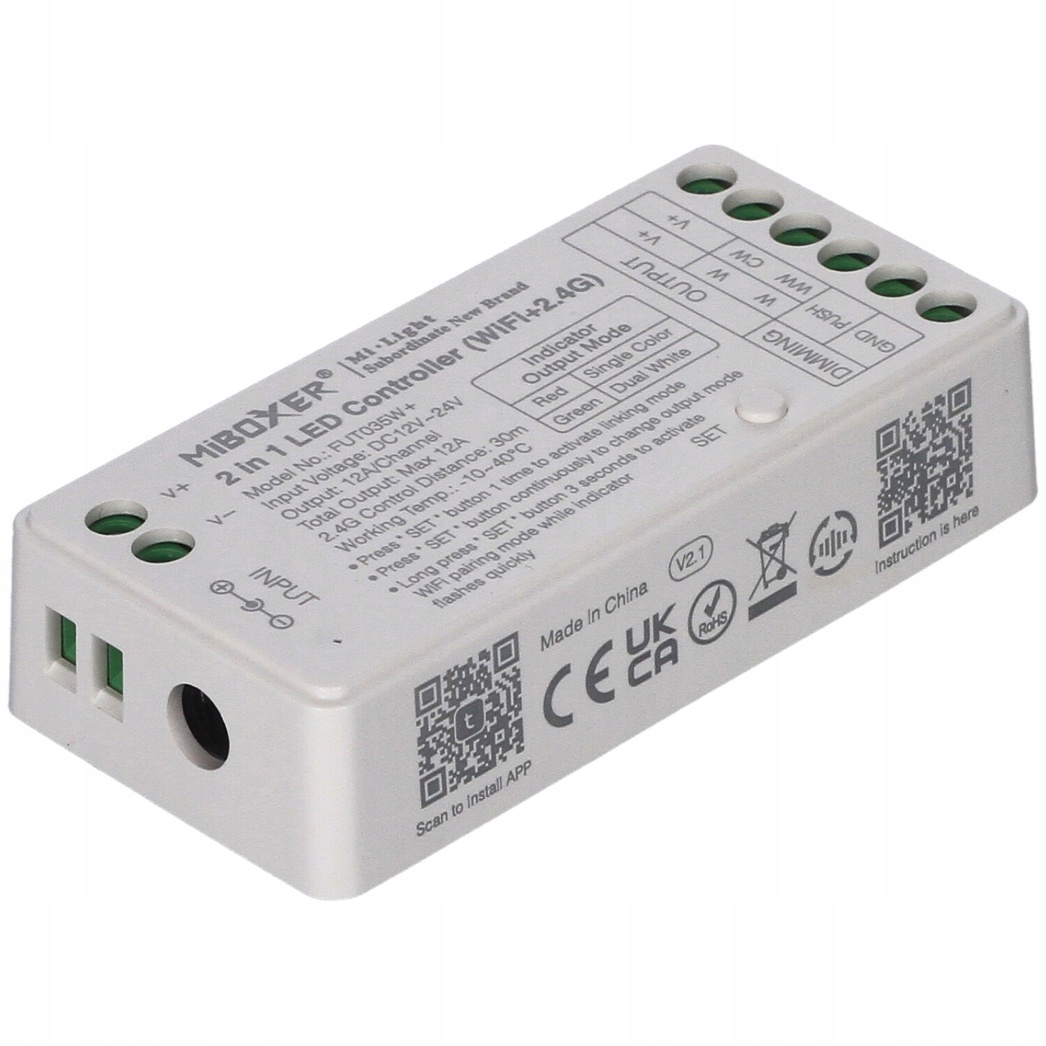 (WiFi+2,4 ГГц), предназначенный для управления светодиодом одним цветом или двумя -цветные полоски CCT непосредственно через телефон (через приложение TUYA Smart Life ) или специальные пульты дистанционного управления. Напряжение питания контроллера - 12-24В постоянного тока, максимальный ток - два канала, 6А на канал (макс. на весь контроллер 12А).