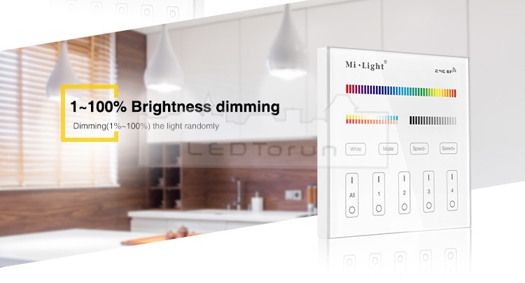 Контроллер компактен, прост в установке и идеально подходит для осветительных установок в офисах или квартирах. Панель питается от сети переменного тока напряжением 230 В. Это усовершенствованное устройство имеет функцию задержки отключения через 60 секунд, что позволяет спокойно покинуть помещение до того, как свет автоматически выключится. Контроллер совместим с лентами RGB, RGBW и RGB+CCT. Он также позволяет управлять лампами серии Milight. Этот пульт дистанционного управления позволяет управлять четырьмя зонами установки.