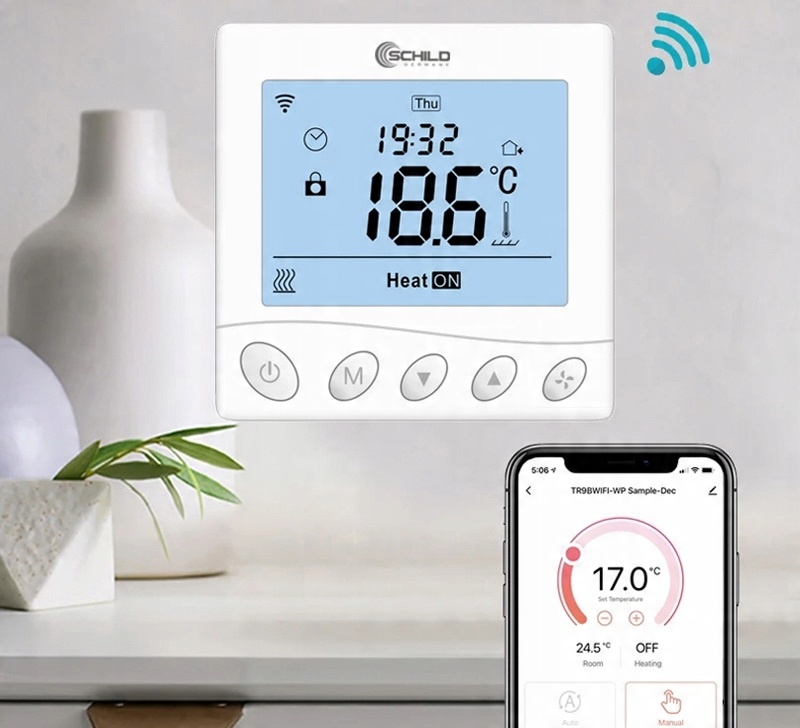 - Термостат также контролируется Wi-Fi, большой экраном, очень современный дизайн Schild BPW-33WIFI с большим экраном, освещенным светодиодом