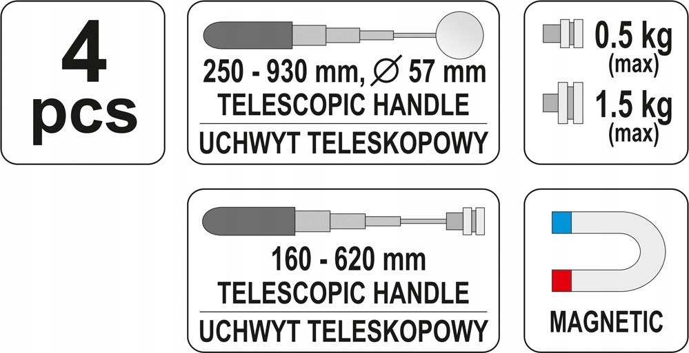 Набор для проверки YATO, предназначенный для работы в профессиональных мастерских и сайты различных отраслей. Смотровое зеркало позволяет осматривать невидимые, потайные места, а магнитный захват используется для вытягивания мелких металлических предметов из щелей и отверстий. Зеркало и захват размещены на телескопической стреле.