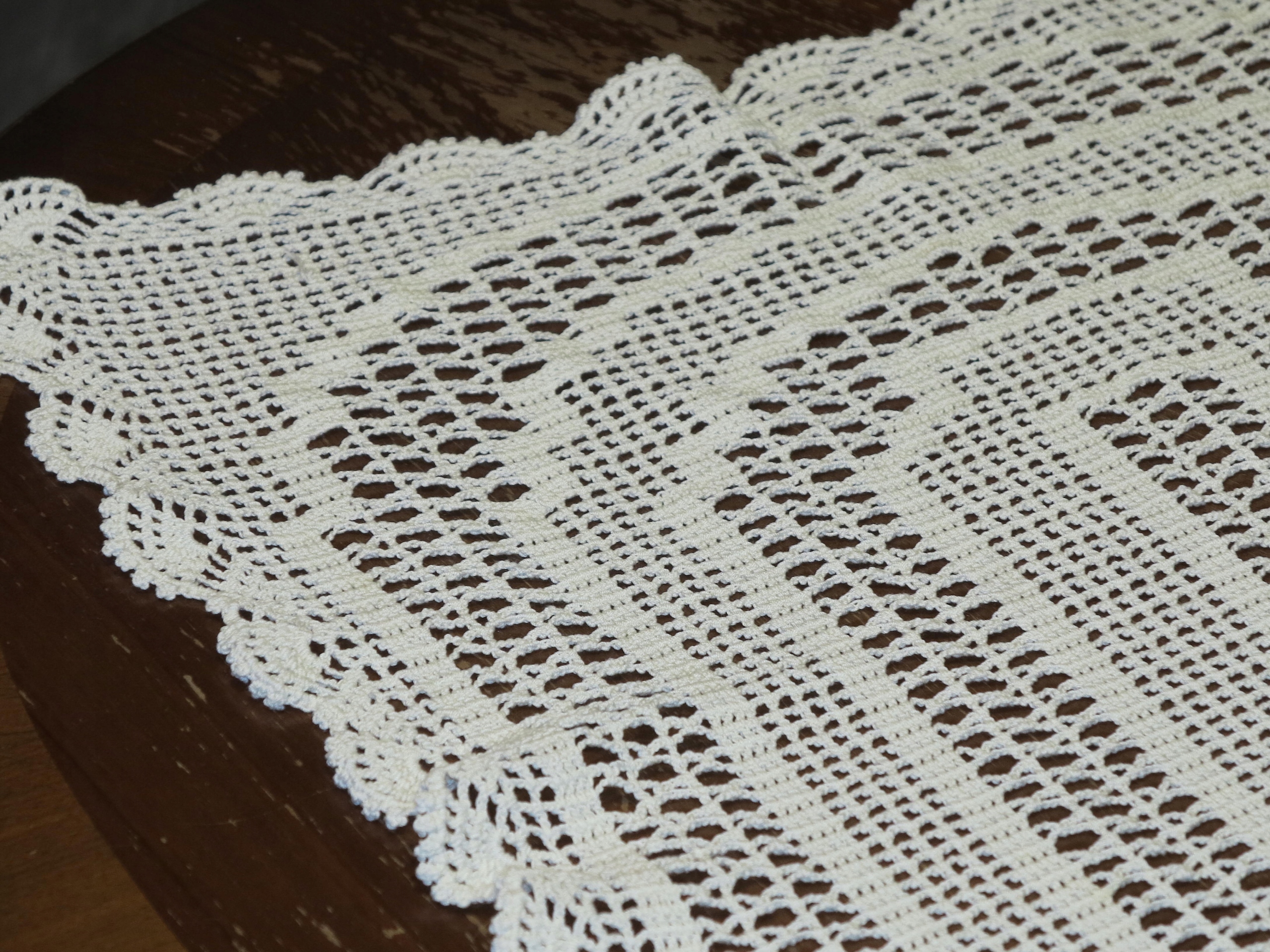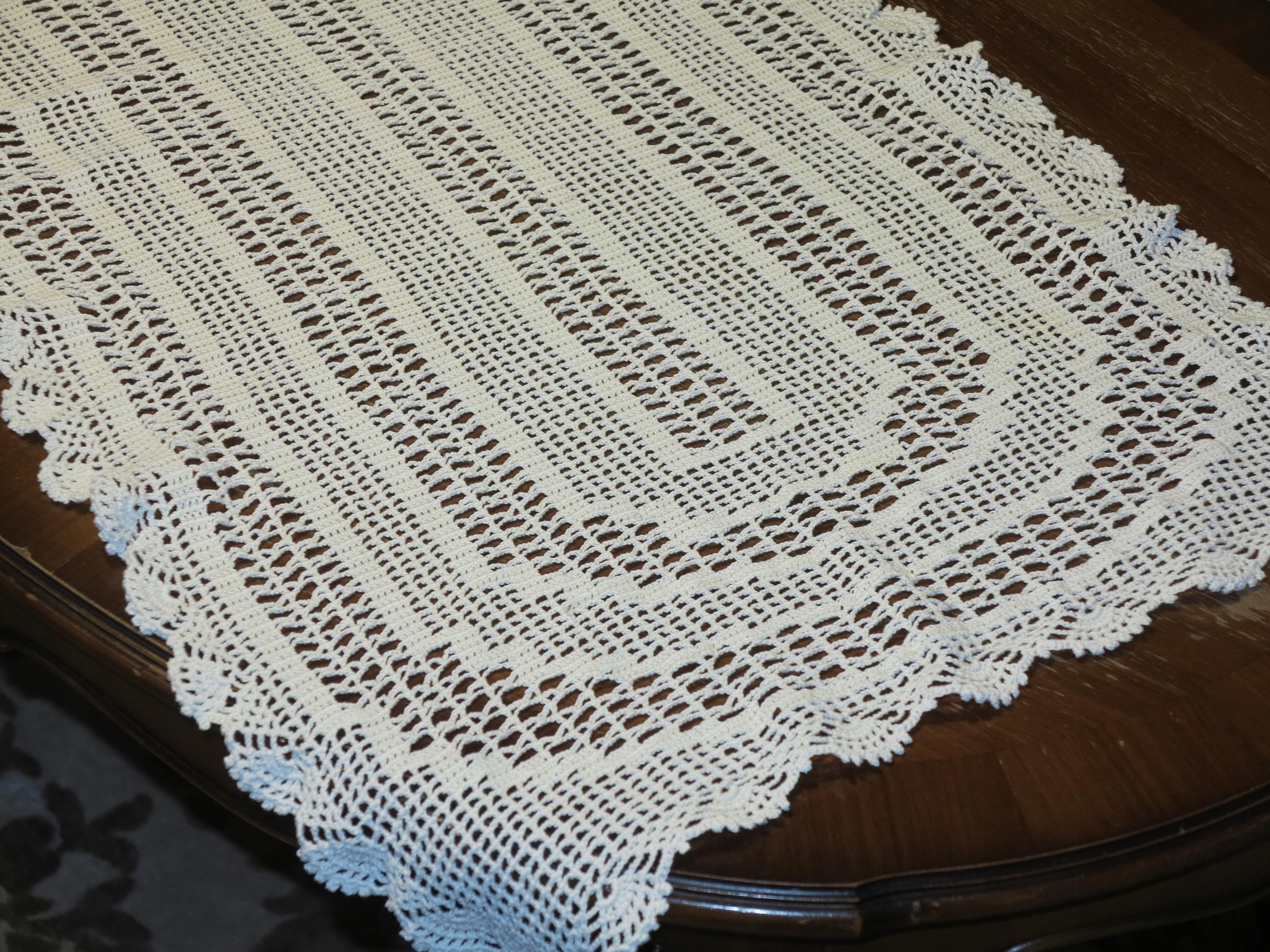 Красивая сложная кардонская скатертью, изготовленная рукой на тонком вязании крючком, в цвете белого белого