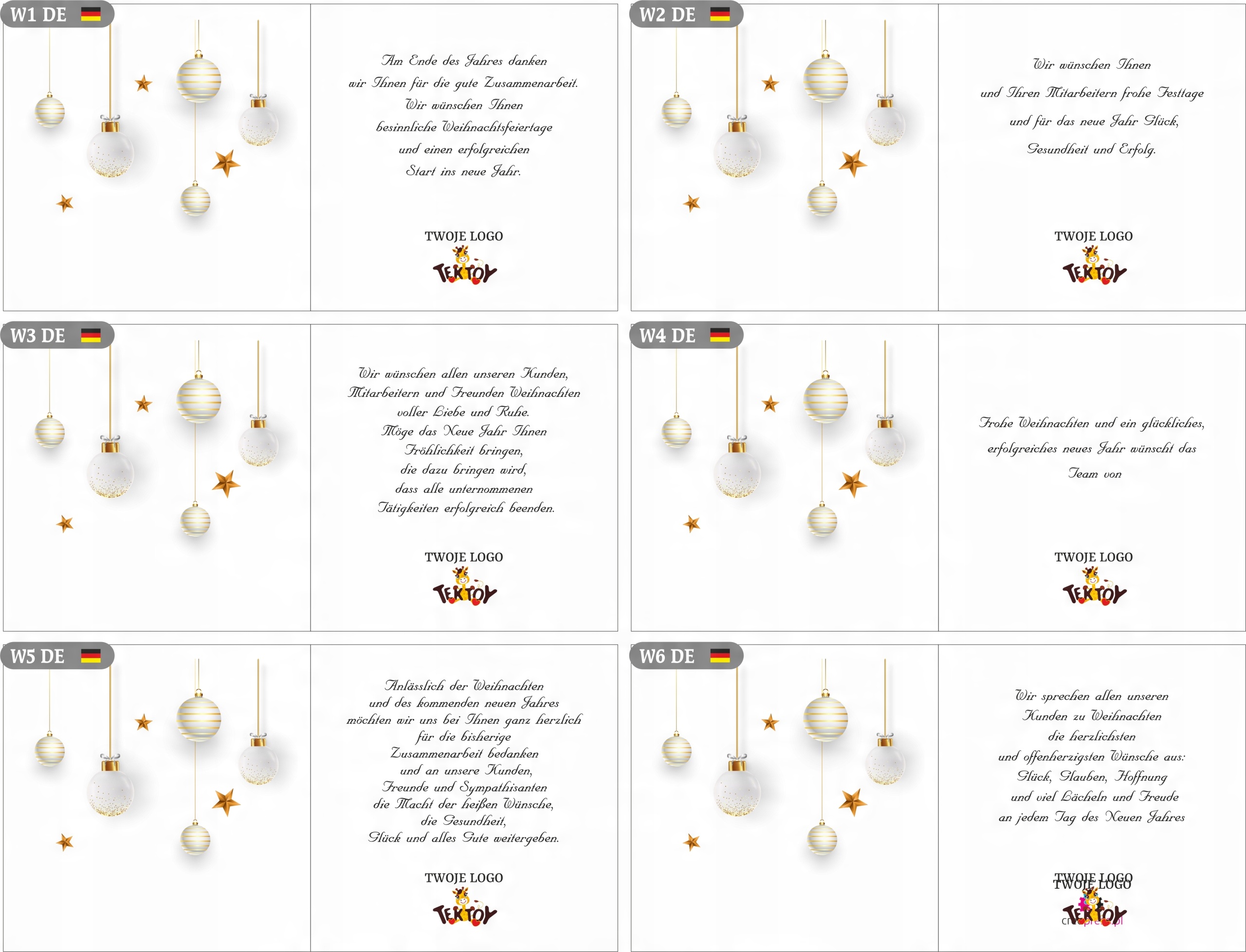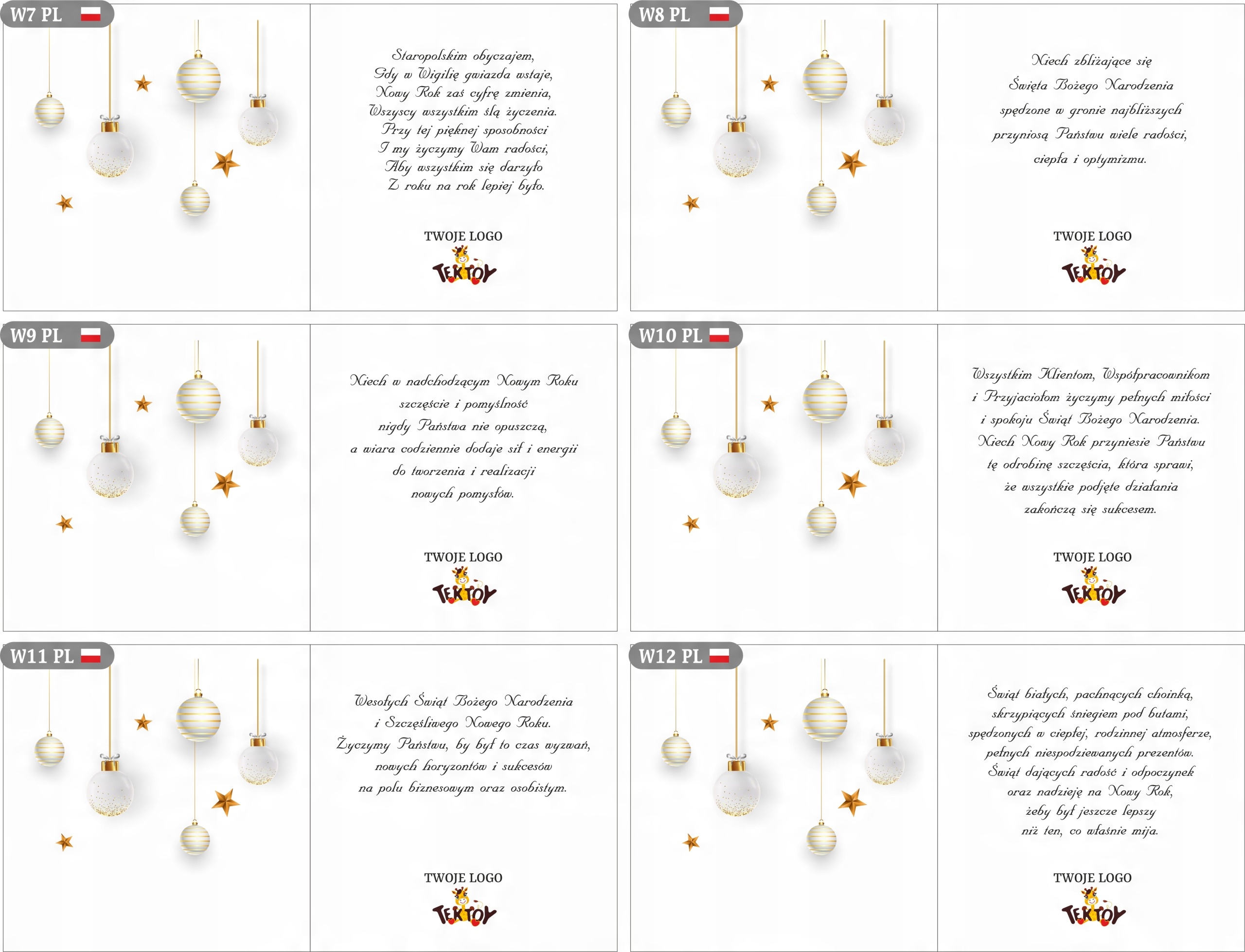 - В рамках заказа мы изготавливаем только один вид открыток (с одним текстом пожеланий и одинаковым логотипом). Если вы хотите заказать больше типов в одном заказе (языковые версии или другие логотипы), купите соответствующее количество типов на нашем аукционе под названием: Дополнительные возможности графического оформления карт Святого. - 15 злотых/шт.