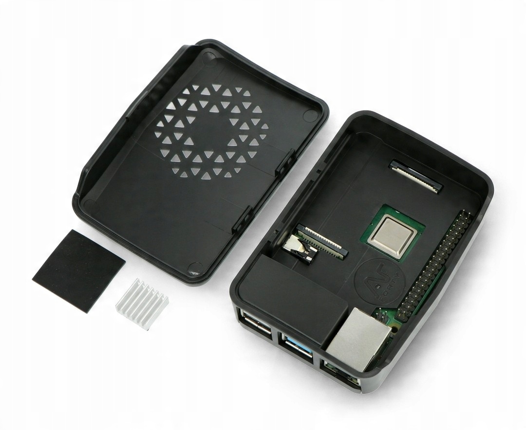 Корпус предназначен для Raspberry Pi 4B, изготовлен из ABS, черного. Верхняя часть корпуса имеет вентиляционные отверстия и крепится защелкой, обеспечивающей полный доступ ко всем разъемам миникомпьютера. В комплект также входит радиатор с термолентой. Корпус собирается с помощью защелок, поэтому его можно разобрать в любой момент. Изделие совместимо с Аргоновым мини-вентилятором.