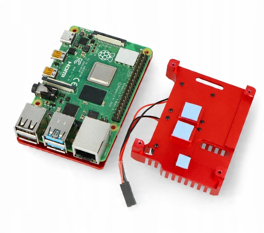 Алюминиевый корпус красного цвета, соответствующий дизайну миникомпьютера Raspberry Pi 4B. Продуманная конструкция и прочная конструкция обеспечивают практичное использование и очень хорошую защиту модуля миникомпьютера от короткого замыкания и механических повреждений. В комплект входят винты и пластины для крепления корпуса.