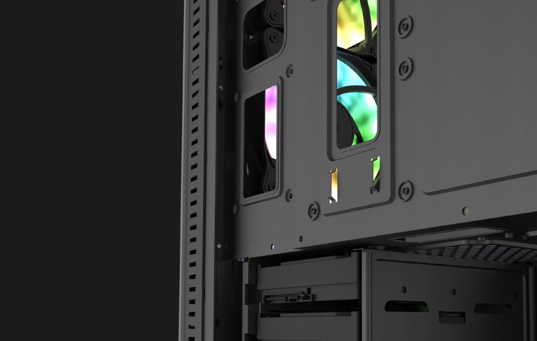 Не беспокойтесь о перегреве компьютера. Изделие может вместить до 8 вентиляторов (приобретаются отдельно) и оснащено внутренним каналом охлаждения. Вы получаете возможность установки водяного охлаждения в верхней части корпуса диаметром 240 мм или двух 120-мм вентиляторов. Спереди можно разместить 360-мм вентиляторы водяного охлаждения или 3 120-мм вентилятора. На задней стороне корпуса вы найдете место для одного 120-мм вентилятора. Над корпусом, предназначенным для источника питания, есть место для двух вентиляторов, благодаря чему можно добиться более эффективного охлаждения и интересного RGB-эффекта.