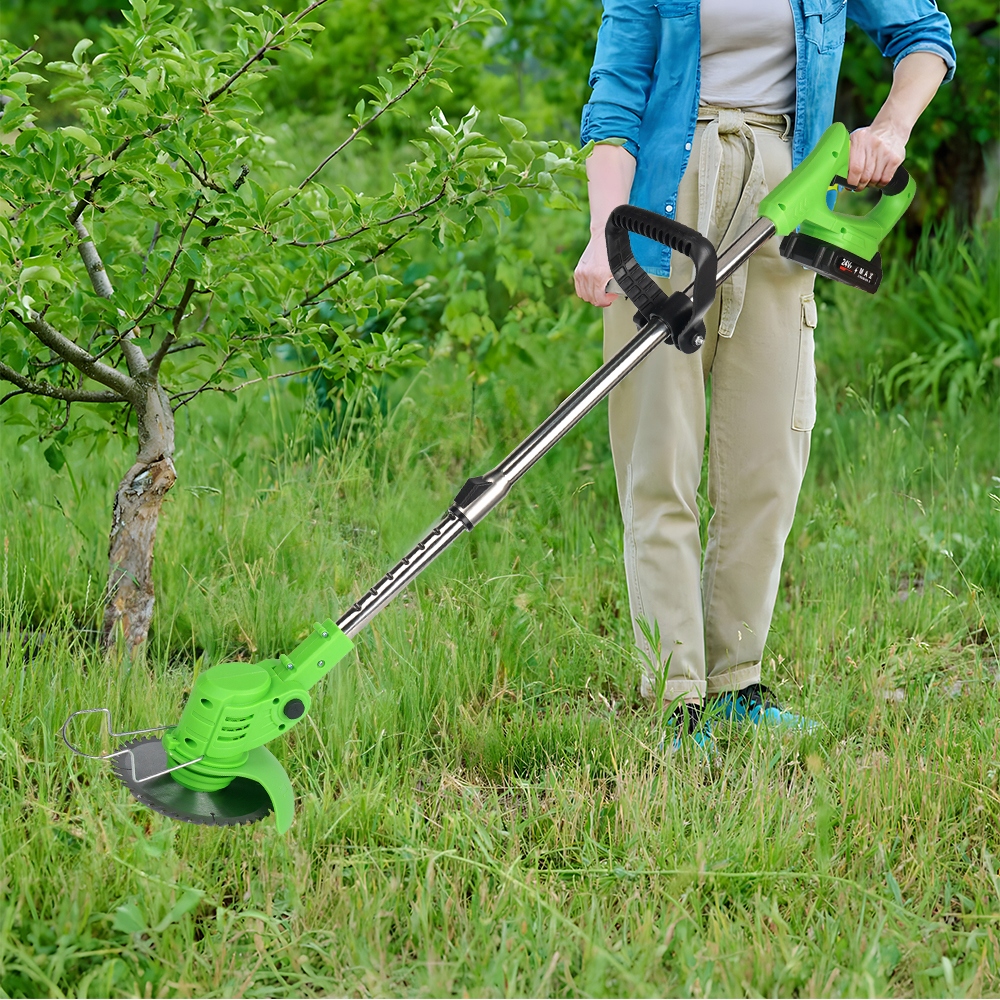 🎀🎀🎀 Светлый и безопасный дизайн: Эта беспроводная косилка легкая и простая в использовании. Угол косилки регулируется, и мы добавили двойной переключатель. Нажатие обе кнопки одновременно запускает электрическую косилку. Переключатель безопасности предотвращает случайное количество детей. Перед первым использованием он должен быть полностью заряжен, чтобы обеспечить ожидаемое рабочее время.