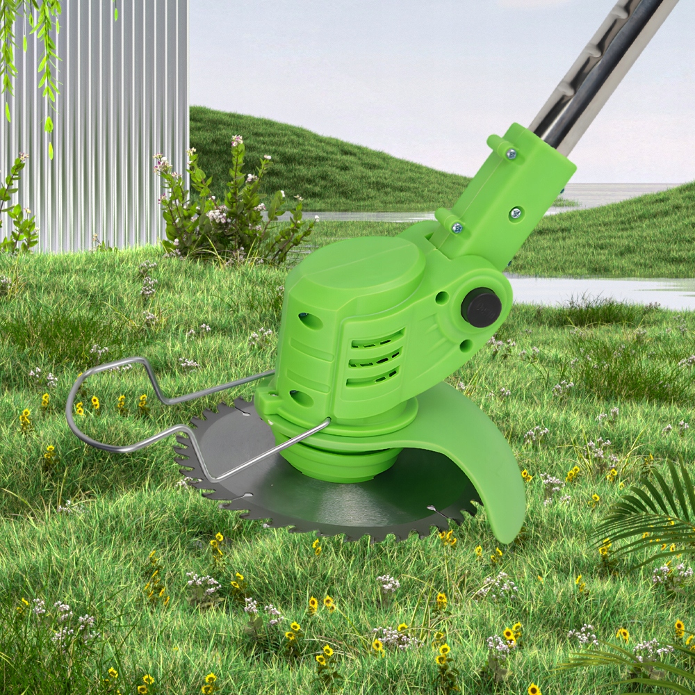 Эта беспроводная косилка оснащена тремя эффективными лезвиями: 1. Пластиковое лезвие, подходящее для обрезки молодой травы; 2. Угловое лезвие, подходящее для обрезки сорняков, небольших кустарников и тонких ветвей; 3. Резка диска подходит для обрезки более толстых ветвей кустарников. Примечание. Пластиковое лезвие подходит только для очень деликатной травы и не подходит для более толстых, более жестких лезвий.