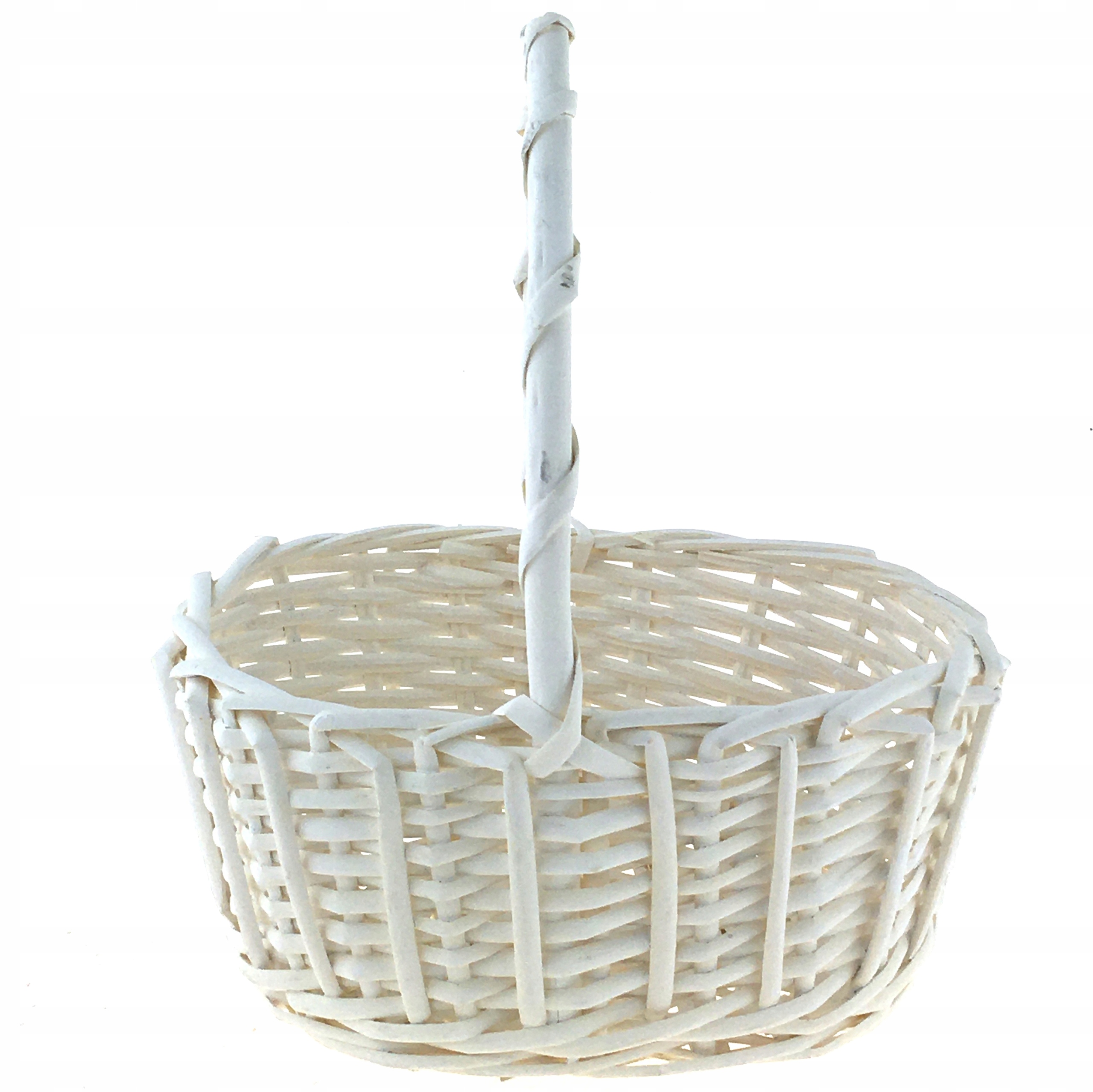 Элегантная, красиво сделанная белая плетеная корзина овальной формы.